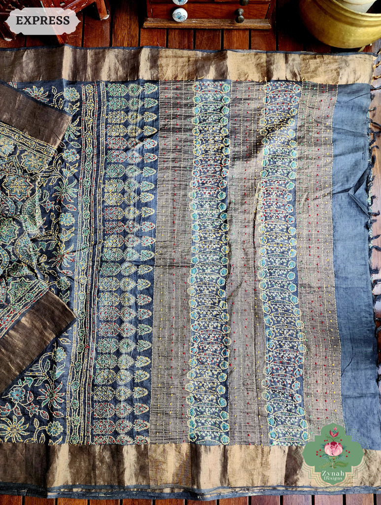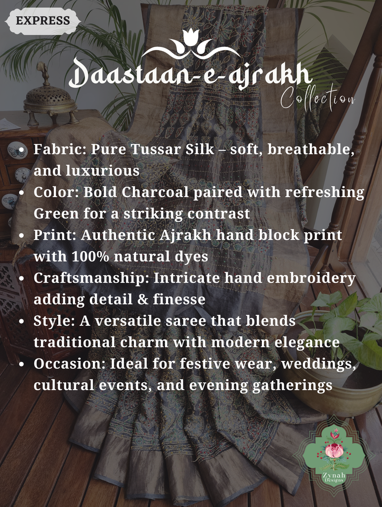 Bold yet refined, this charcoal and green pure Tussar silk saree is hand block printed using natural dyes, making it a sustainable and elegant choice. Delicate hand embroidery enhances its traditional Ajrakh patterns, offering depth and richness to its overall appeal. Perfect for festive evenings, weddings, or cultural events, it carries an aura of understated grandeur. The earthy tones paired with the luxurious texture of silk create an effortlessly graceful drape. Designed for the woman who values timeless craft and distinctive style, this saree is a must-have. Shop this hand block printed natural dye saree today and radiate charm.