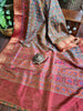 Our Blue Jute Tussar Kalamkari Saree is a unique and exquisite masterpiece, fusing traditional Indian artistry with modern design. The intricate Frenchknot motifs and Kantha hand embroidery at the pallu and border create a stunning contrast against the rich blue jute tussar fabric. Delicately crafted sequins add to the glamour of this saree, making it a true statement piece that exudes elegance and sophistication. Perfect for any special occasion, this saree will undoubtedly enhance your wardrobe with its exceptional beauty.