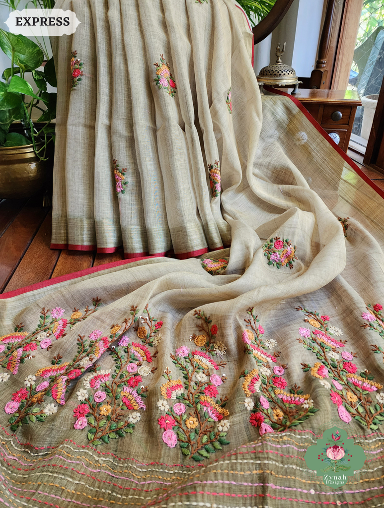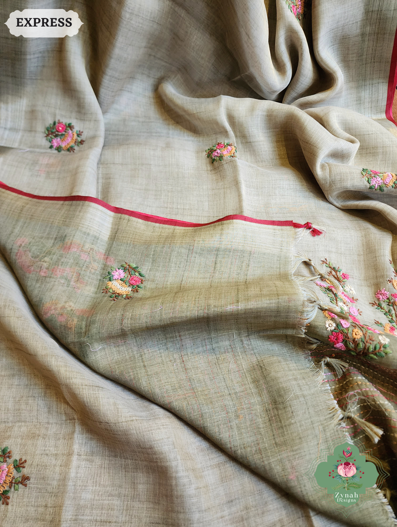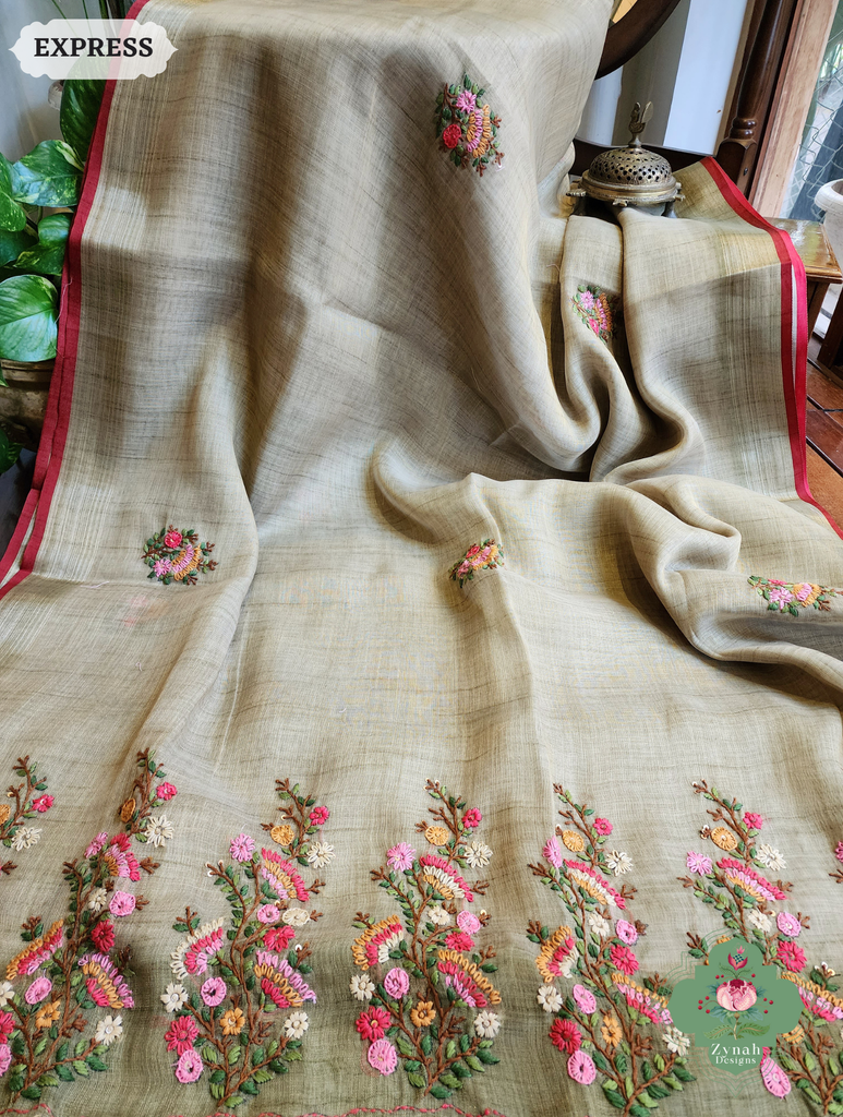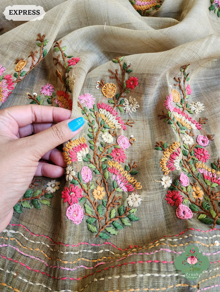Zynah Henna Green Linen Tissue Saree Adorned With French-knot & Kantha Hand Embroidery; Custom Stitched/Ready-made Blouse, Fall, Petticoat; SKU: 1903202506