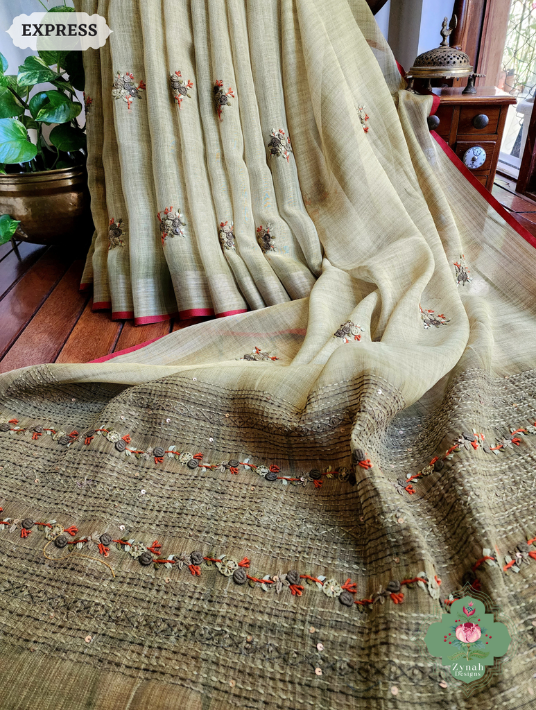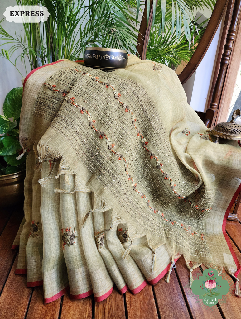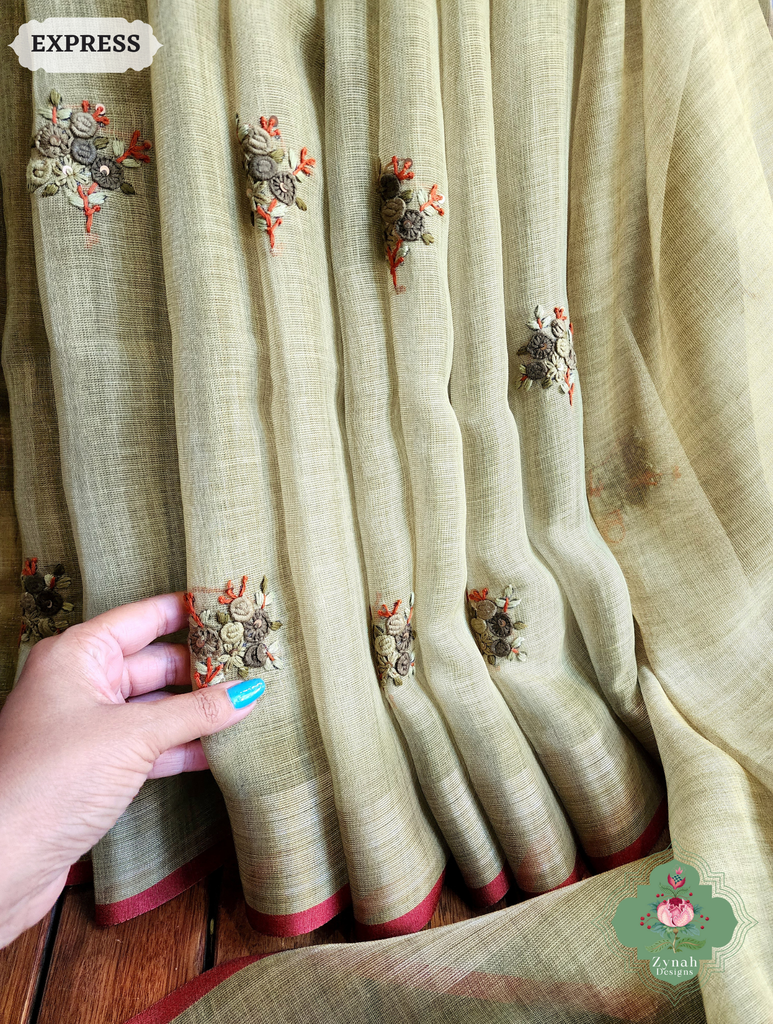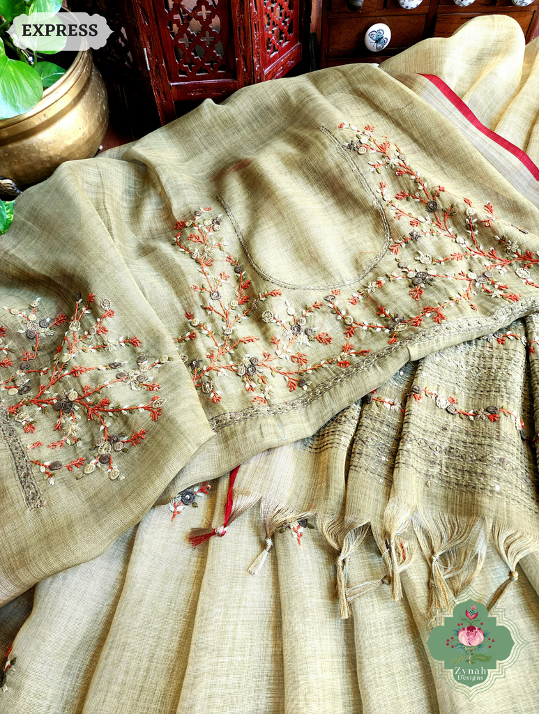 Zynah Henna Green Linen Tissue Saree Adorned With French-knot & Kantha Hand Embroidery; Custom Stitched/Ready-made Blouse, Fall, Petticoat; SKU: 1903202507