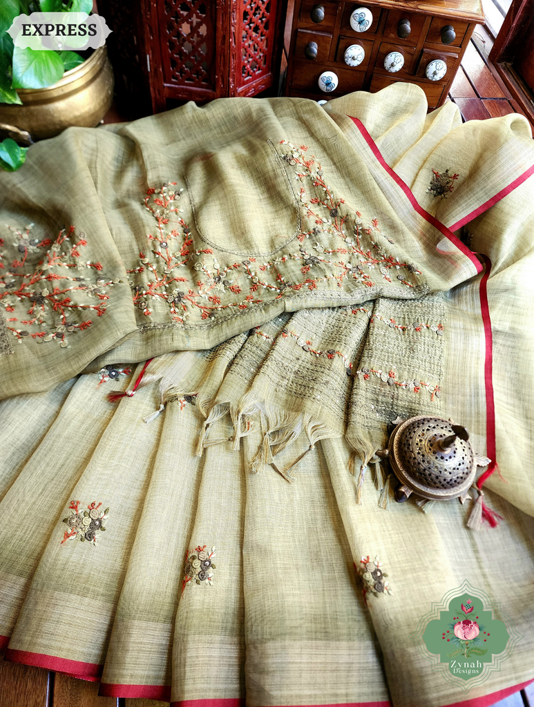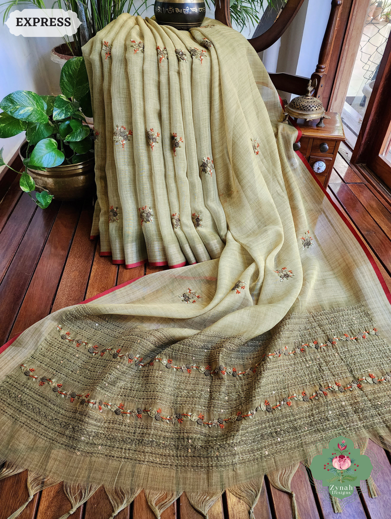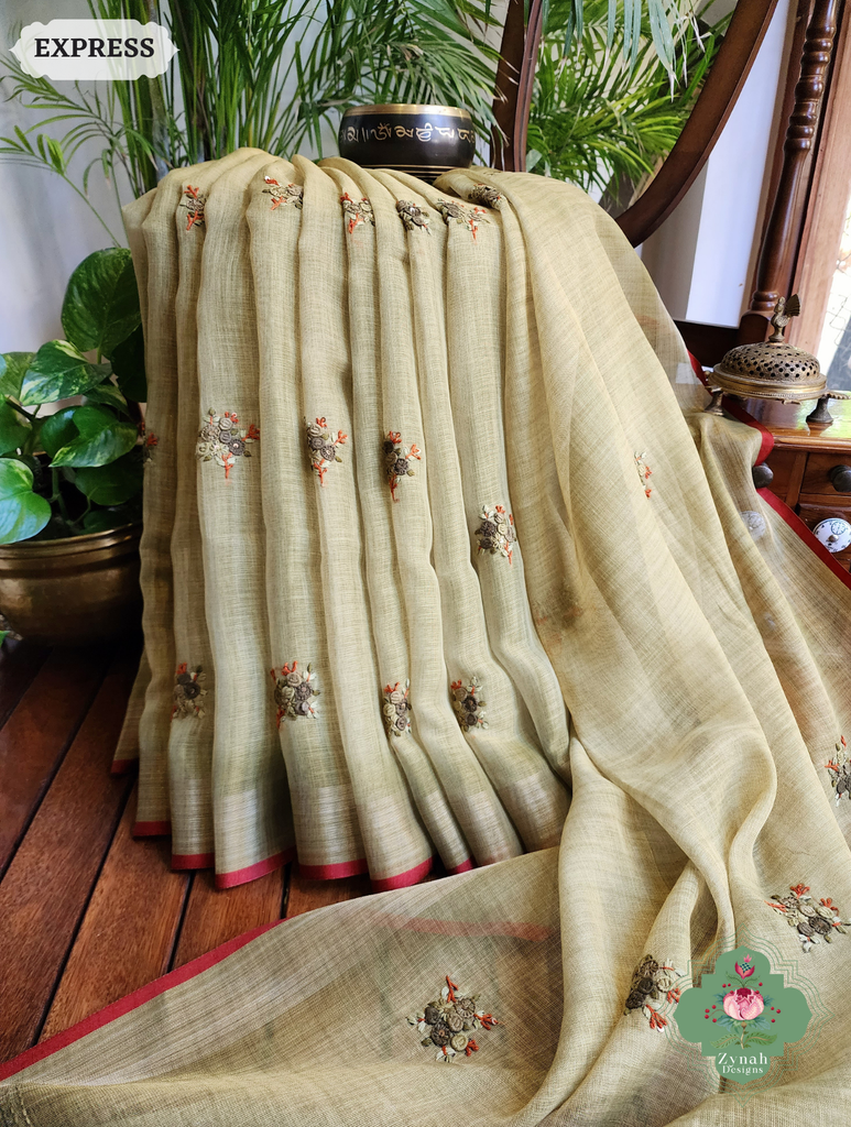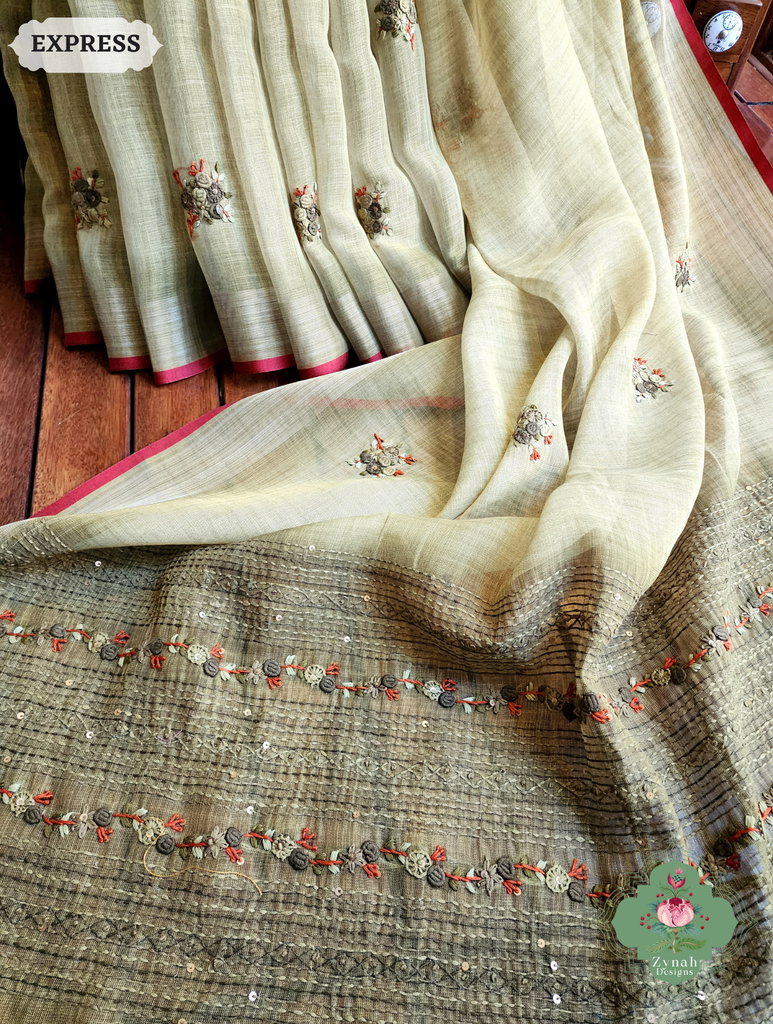 Zynah Henna Green Linen Tissue Saree Adorned With French-knot & Kantha Hand Embroidery; Custom Stitched/Ready-made Blouse, Fall, Petticoat; SKU: 1903202507