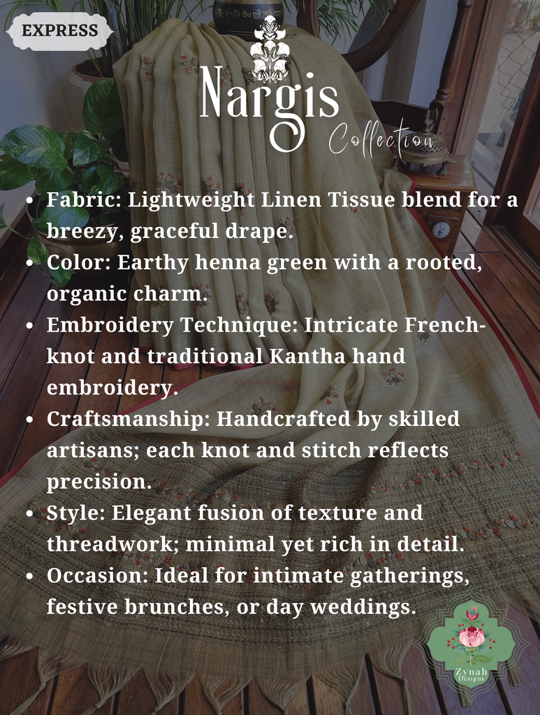 Grounded in grace, this Henna Green Linen Tissue Saree is a harmonious blend of depth and detail. Featuring fine French-knot and Kantha hand embroidery, each thread adds character to its rich, earthy tone. The fabric flows with a natural ease, offering a silhouette that is both poised and effortless. Ideal for cultural events or intimate celebrations, it reflects quiet strength and refined style. Make it yours and let elegance unfold with every moment.
