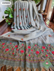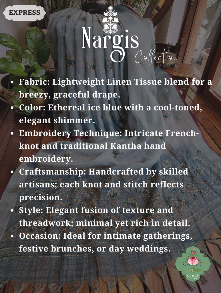 Cool and captivating, this Ice Blue Linen Tissue Saree is a vision of delicate refinement. Adorned with intricate French-knot and Kantha hand embroidery, it brings soft texture and elegant detail to a refreshing hue. The sheer linen tissue fabric catches the light with a gentle shimmer, draping effortlessly for a graceful silhouette. Perfect for daytime occasions or moonlit gatherings, it evokes a sense of calm sophistication. Make it yours and embrace the elegance of stillness in motion.