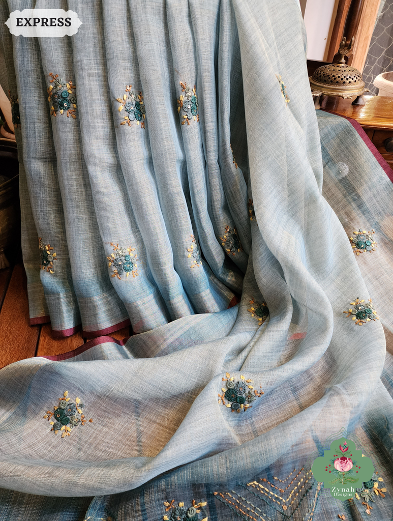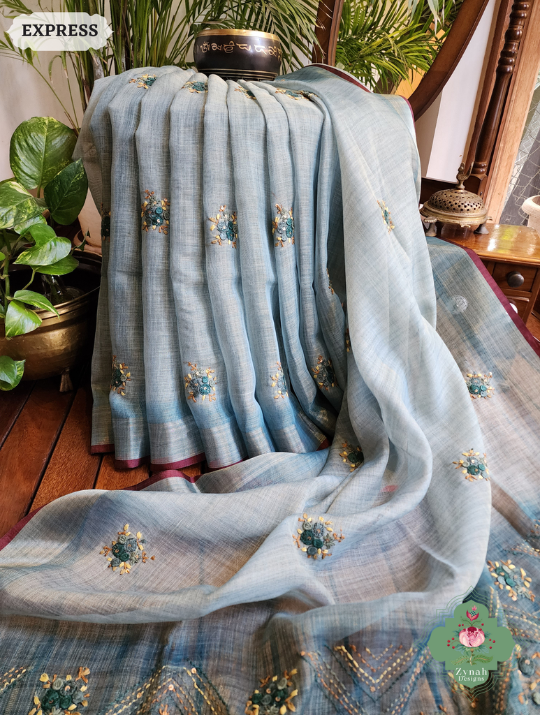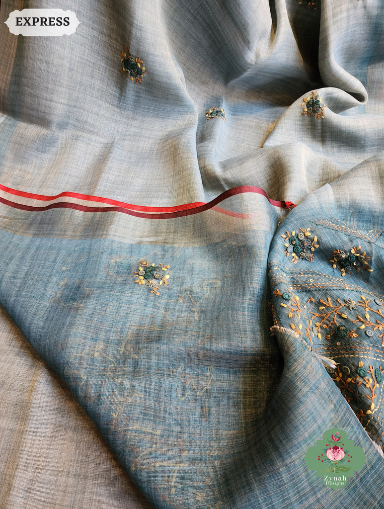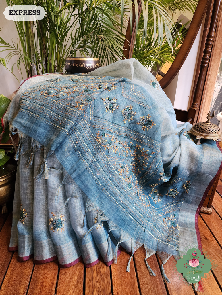 Zynah Ice Blue Linen Tissue Saree Adorned With French-knot & Kantha Hand Embroidery; Custom Stitched/Ready-made Blouse, Fall, Petticoat; SKU: 1903202503
