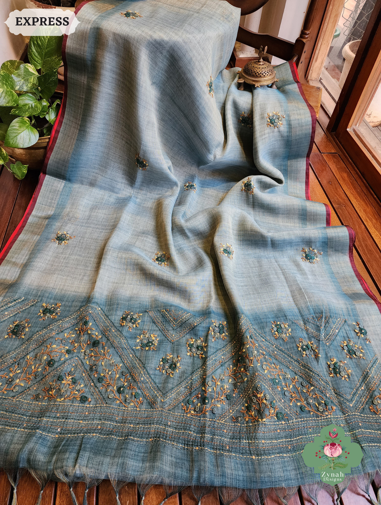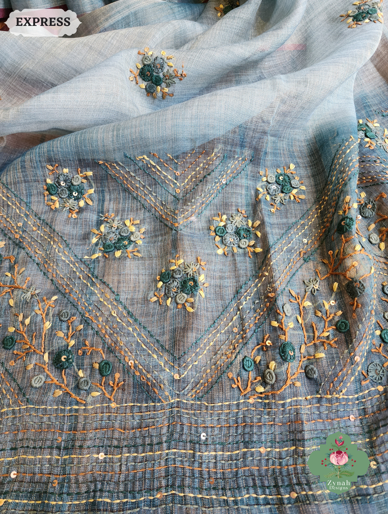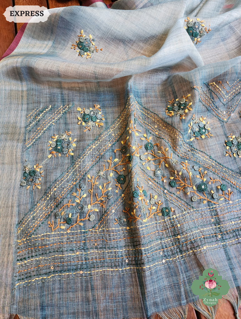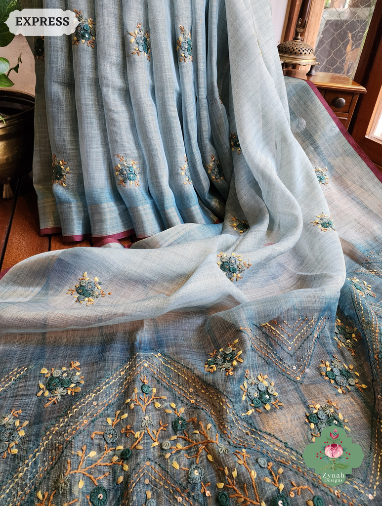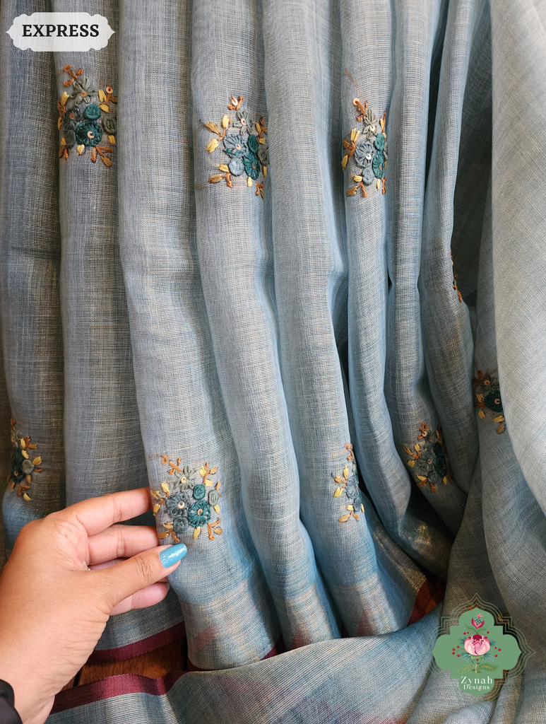 Zynah Ice Blue Linen Tissue Saree Adorned With French-knot & Kantha Hand Embroidery; Custom Stitched/Ready-made Blouse, Fall, Petticoat; SKU: 1903202503