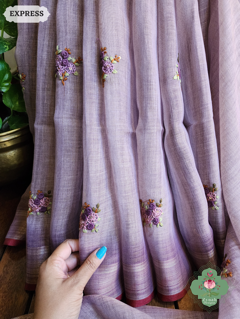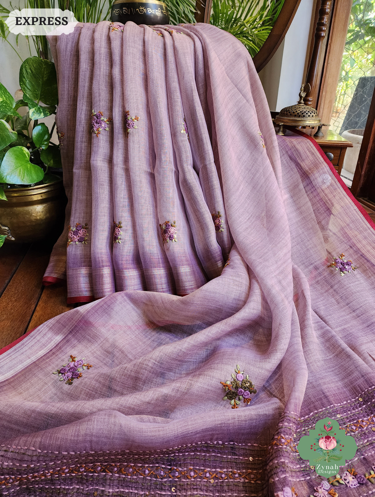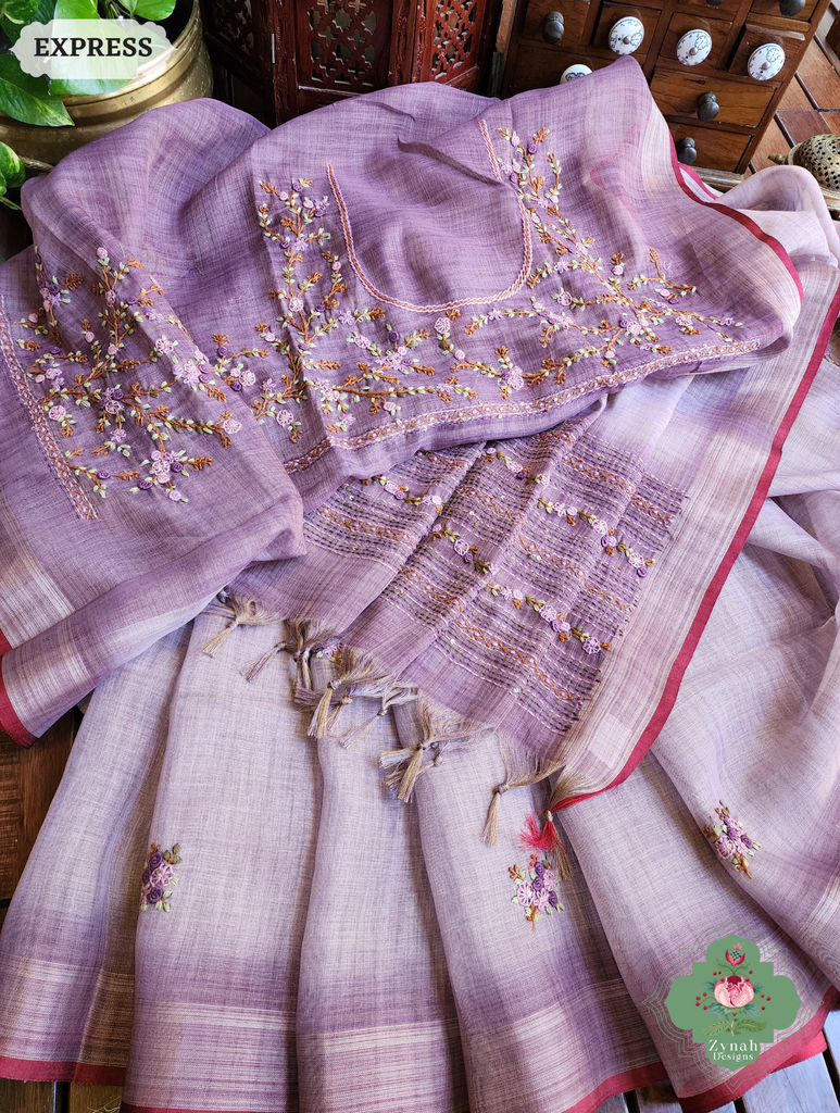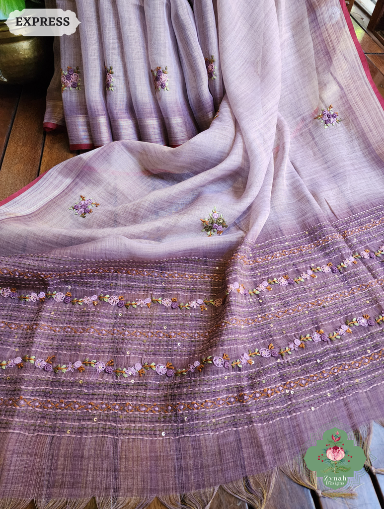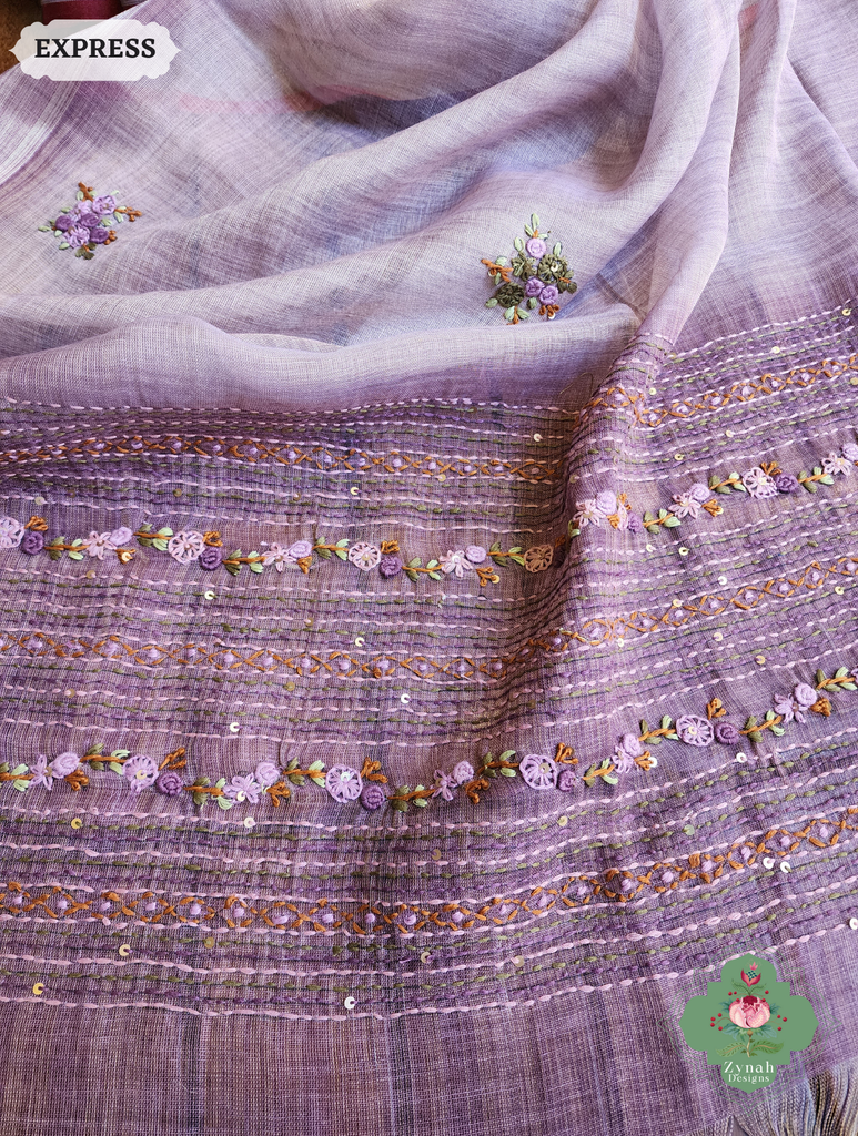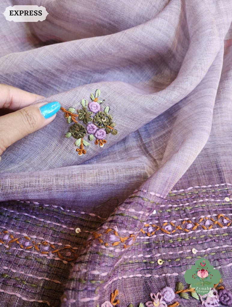 Elegant and serene, this Lilac Linen Tissue Saree is a perfect balance of softness and sophistication. Intricate French-knot and Kantha hand embroidery add refined detail to its gentle hue, creating a look that feels both fresh and timeless. The lightweight linen tissue fabric drapes with ease, offering a graceful flow that complements every movement. Ideal for intimate occasions or daytime celebrations, it embodies understated charm. Make it yours and let your style speak with quiet confidence.
