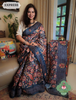 The saree features contrast color print in a swiveling manner all over the body of the saree. The border and pallu have plain golden zari weave with colorful and geometrical florals and patterns adding a unique look to the saree. This comes with a contrasting color blouse piece.