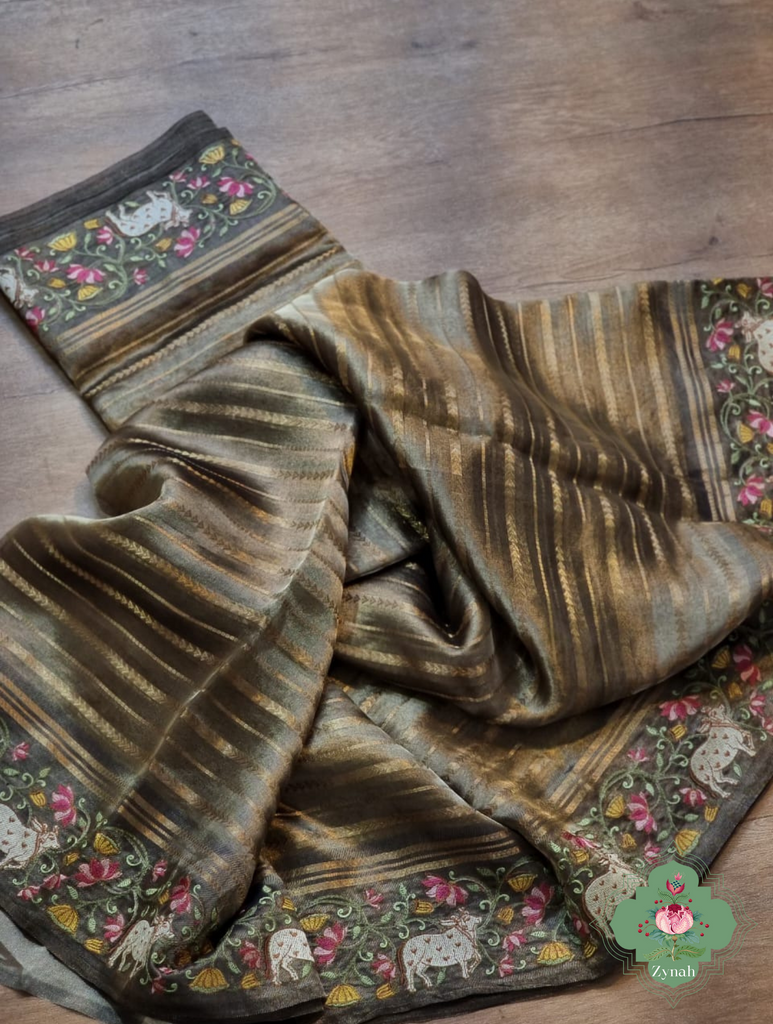 Zynah Olive Tissue Silk Saree With Banarasi Stripes, Katan Pallu & Pichwai Embroidery; Custom Stitched/Ready-made Blouse, Fall, Petticoat; SKU: 0401202407