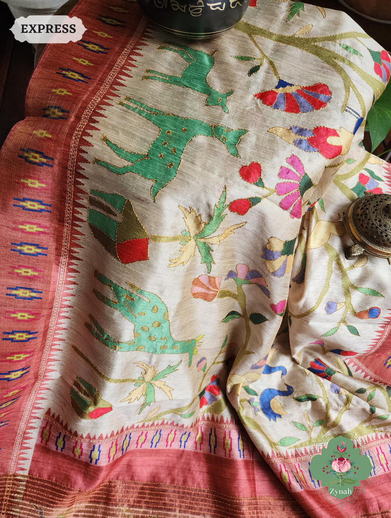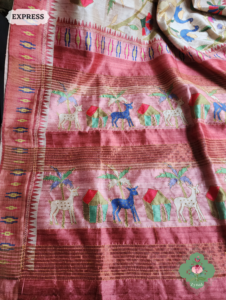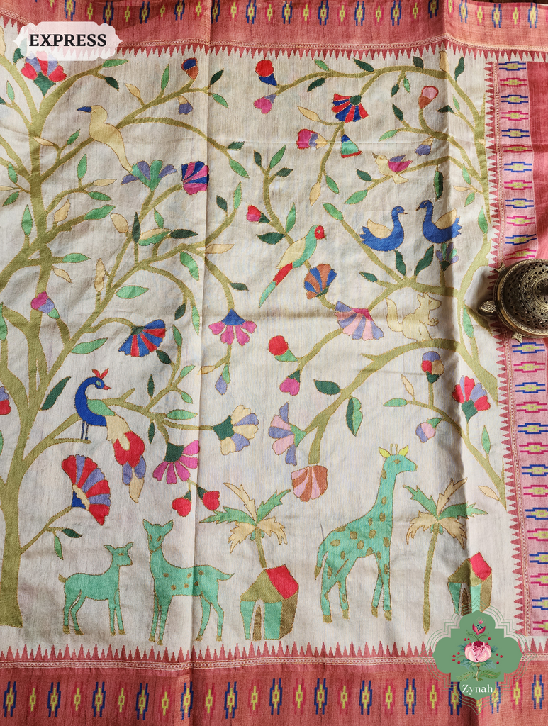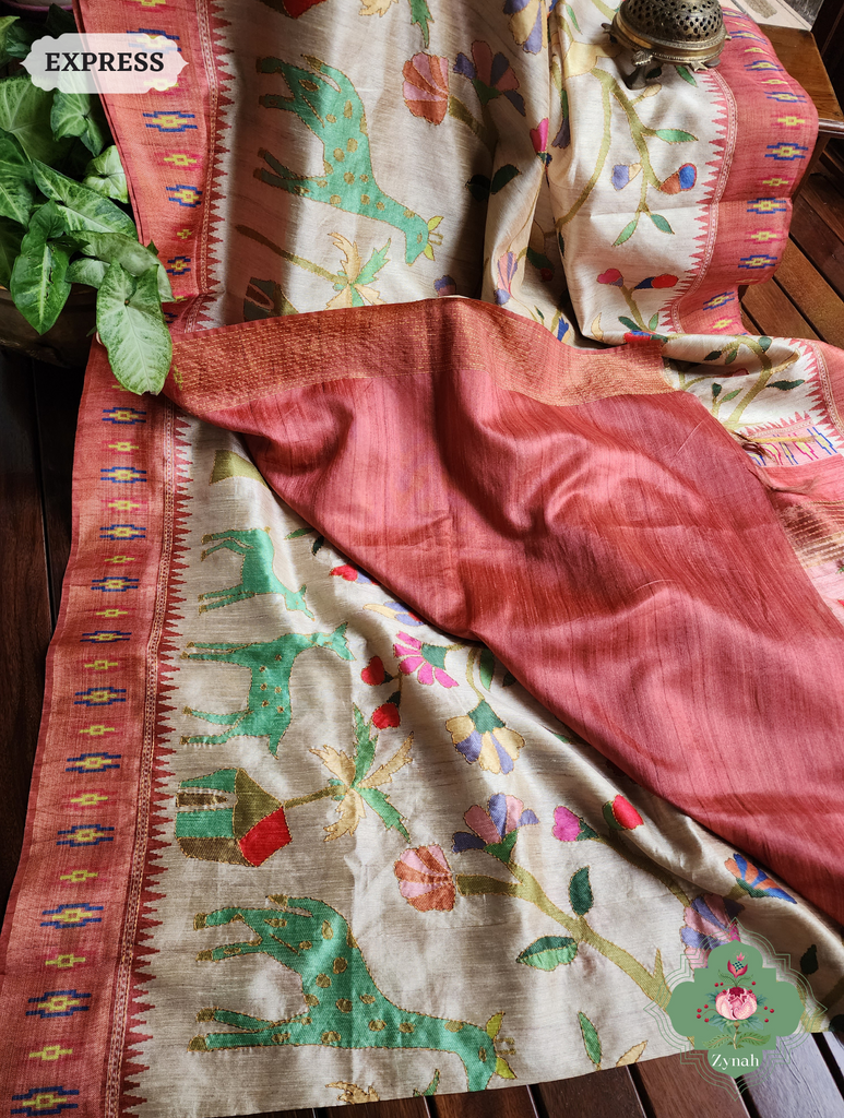 Zynah Beige & Coral Jute Linen Saree With Kantha Work & Flora & Fauna Motifs; Custom Stitched/Ready-made Blouse, Fall, Petticoat; SKU: 2109202310