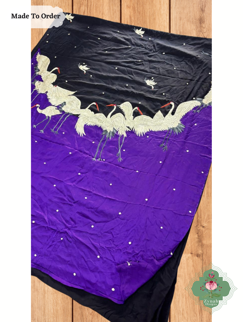 Zynah Made To Order Black & Aubergine Pure Crepe Silk Hand Embrodered Parsi Gara Saree With Designer Motifs of Cranes & Swans; Custom Stitched/Ready-made Blouse, Fall, Petticoat; SKU: 0812202501