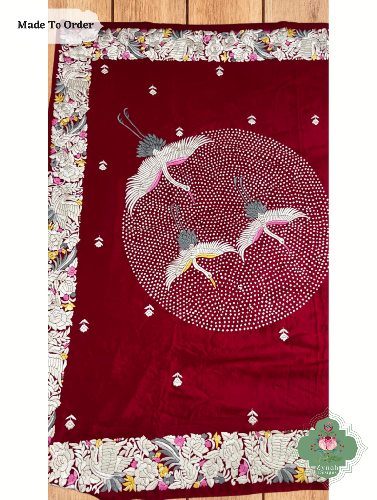 Zynah Made To Order Red Pure Crepe Silk Hand Embrodered Parsi Gara Saree; Custom Stitched/Ready-made Blouse, Fall, Petticoat; SKU: 0812202503