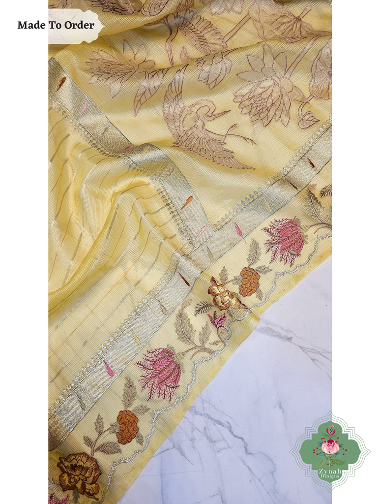 Zynah Made To Order Yellow Kota Tussar Silk Saree With Embroidery; Custom Stitched/Ready-made Blouse, Fall, Petticoat; SKU: 1510202505