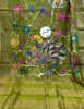This is a beautiful tussar silk saree in subtle cream color with hand-painted kalamkari designs.