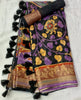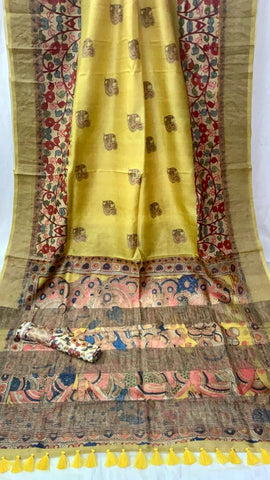 This is a beautiful pure tussar silk saree with digital kalamkari print. This is a very softly acid-washed and strong-quality saree.The saree features colorful and attractive floral leafy vines all over the body of the saree. The contrasting color border and solid zari weave upon that are highlighting and look very beautiful. The pallu has zari stripes weave and huge peacock motifs. The pallu edges are beautified with adorable contrast color tassels adding elegance to the saree. This saree comes with a printed blouse piece with a zari weave border and silk mark certificate.