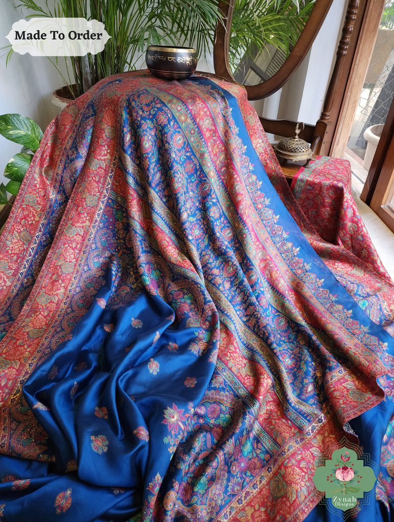A tribute to Kashmiri grandeur, this Blue Kashmiri Pure Kani Silk Jamavar Saree is a canvas of timeless artistry. Scattered floral butis grace the body, while the border and pallu bloom with exquisite Mughal-inspired floral motifs, woven in intricate Kani craftsmanship. Each thread tells a story of elegance, making this Handwoven Kashmiri Kani Silk Saree a treasure for those who appreciate tradition. An Authentic Kani Jamavar Silk Saree, perfect for celebrations and heirloom collections, it drapes with unmatched grace. Order now!