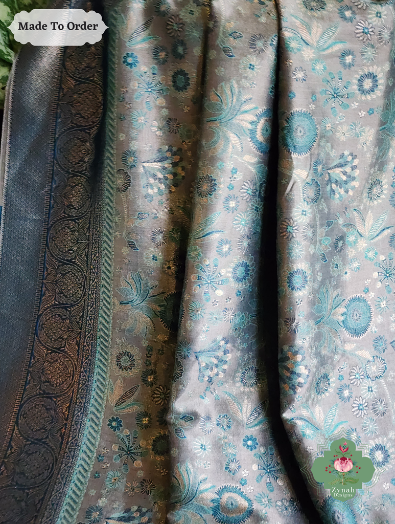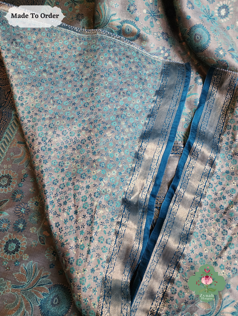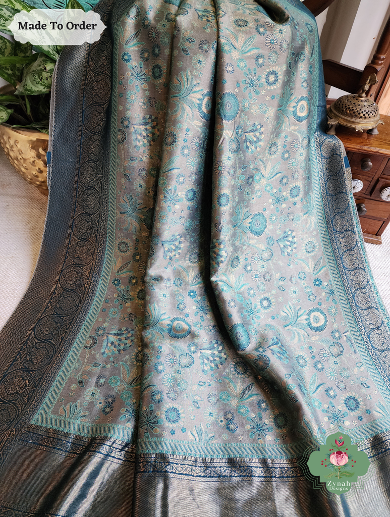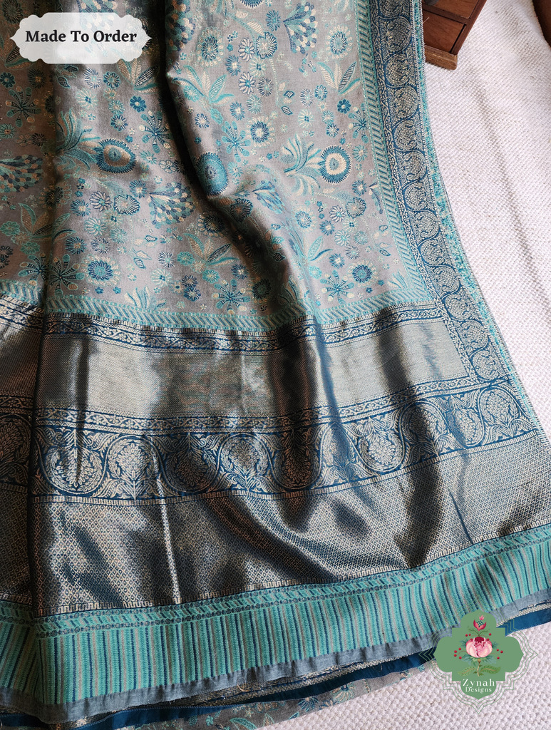 Soft yet striking, this Grey Handwoven Kashmiri Pure Kani Tissue Silk Jamavar Saree is adorned with delicate Persian floral motifs in soothing aqua, beautifully set against a grey backdrop. The heavy pallu adds depth and elegance, creating a drape that flows gracefully with every movement. Perfect for festive gatherings or special occasions, this saree blends subtle charm with refined style. Own this timeless piece today and let every moment shine with effortless elegance.
