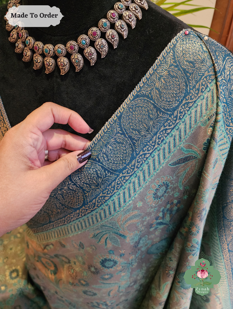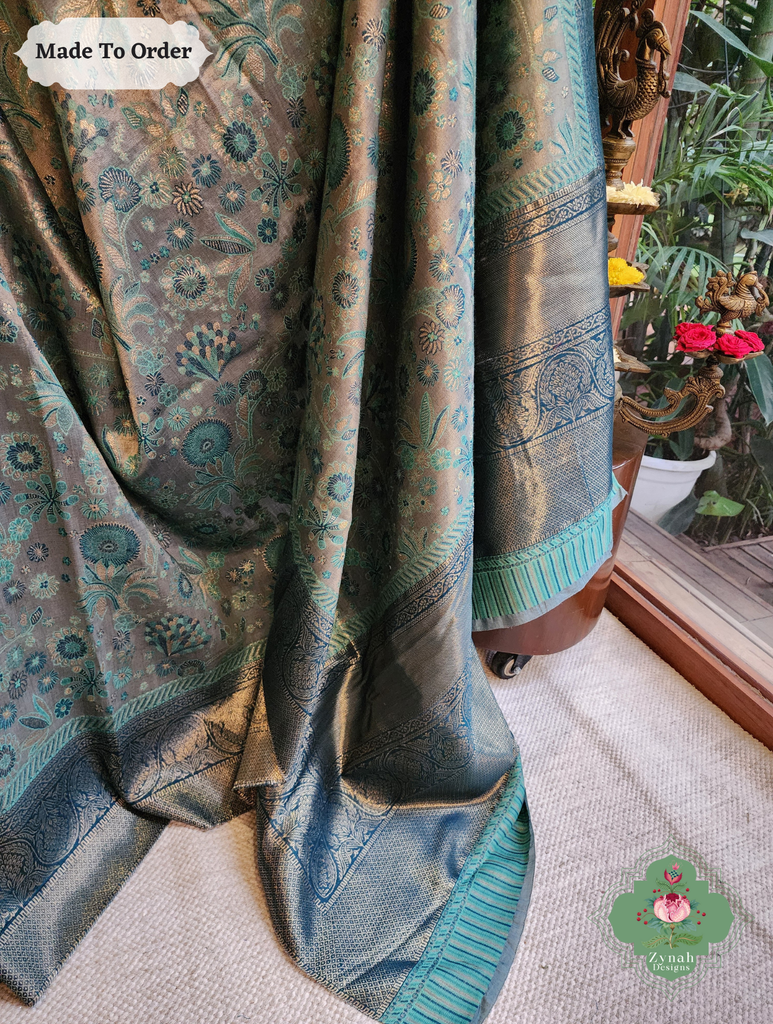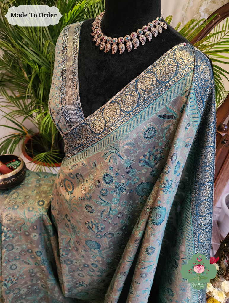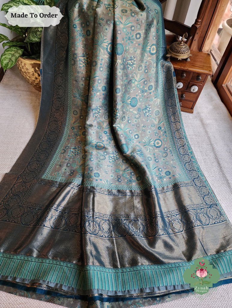 Soft yet striking, this Grey Handwoven Kashmiri Pure Kani Tissue Silk Jamavar Saree is adorned with delicate Persian floral motifs in soothing aqua, beautifully set against a grey backdrop. The heavy pallu adds depth and elegance, creating a drape that flows gracefully with every movement. Perfect for festive gatherings or special occasions, this saree blends subtle charm with refined style. Own this timeless piece today and let every moment shine with effortless elegance.