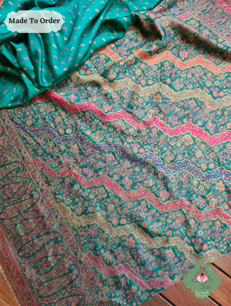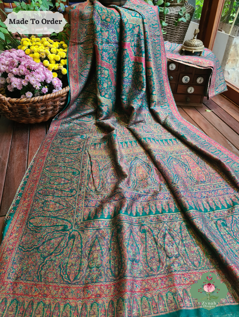 About The Craft: Kashmiri Pure Kani Silk Jamavar Sarees are woven using an ancient and intricate technique that dates back centuries. The weaving process involves wooden 'Kani' spools, each carrying a different colored thread, carefully interlaced to create elaborate patterns without any embroidery or printing. Weavers follow a coded pattern called ‘Talim,’ which guides them in crafting the design, sometimes taking months or even years to complete a single saree. The motifs, deeply inspired by Persian and Mughal art, include paisleys, florals, chinar leaves, and intricate vines, symbolizing nature and cultural richness. The luxurious blend of Pashmina and silk ensures a soft, warm, and regal drape, making these sarees a true testament to Kashmir’s textile heritage.