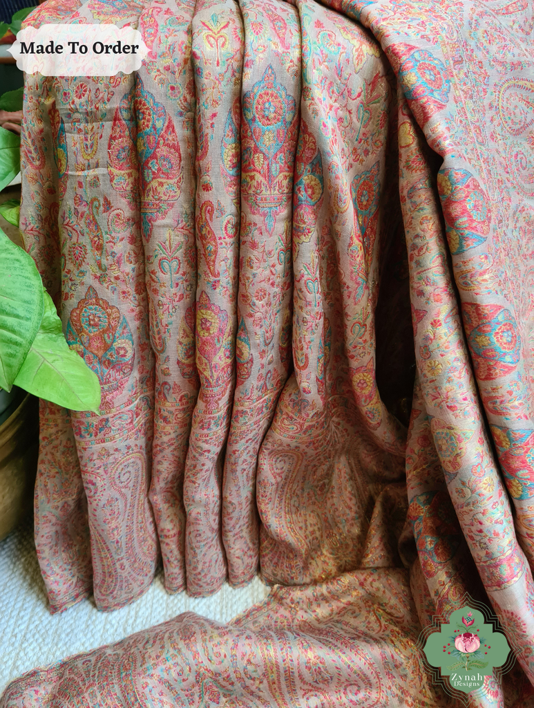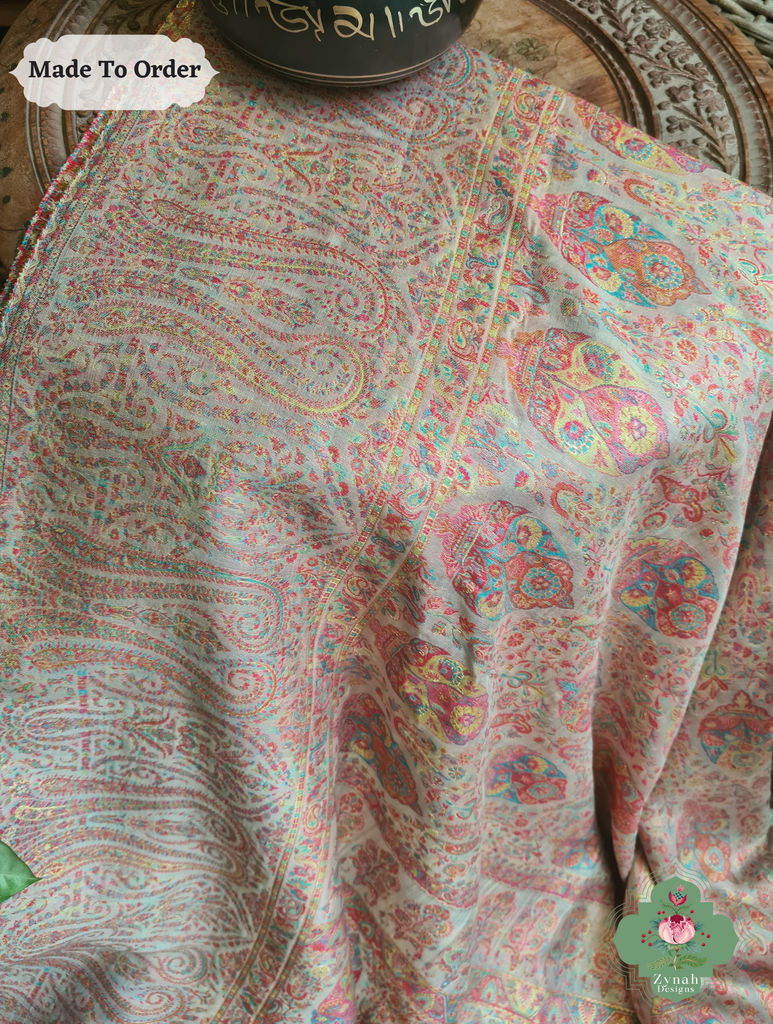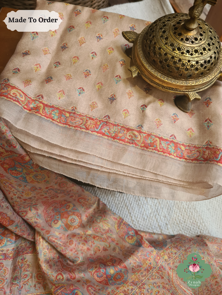 About The Craft: Kashmiri Pure Kani Silk Jamavar Sarees are woven using an ancient and intricate technique that dates back centuries. The weaving process involves wooden 'Kani' spools, each carrying a different colored thread, carefully interlaced to create elaborate patterns without any embroidery or printing. Weavers follow a coded pattern called ‘Talim,’ which guides them in crafting the design, sometimes taking months or even years to complete a single saree. The motifs, deeply inspired by Persian and Mughal art, include paisleys, florals, chinar leaves, and intricate vines, symbolizing nature and cultural richness. The luxurious blend of Pashmina and silk ensures a soft, warm, and regal drape, making these sarees a true testament to Kashmir’s textile heritage.
