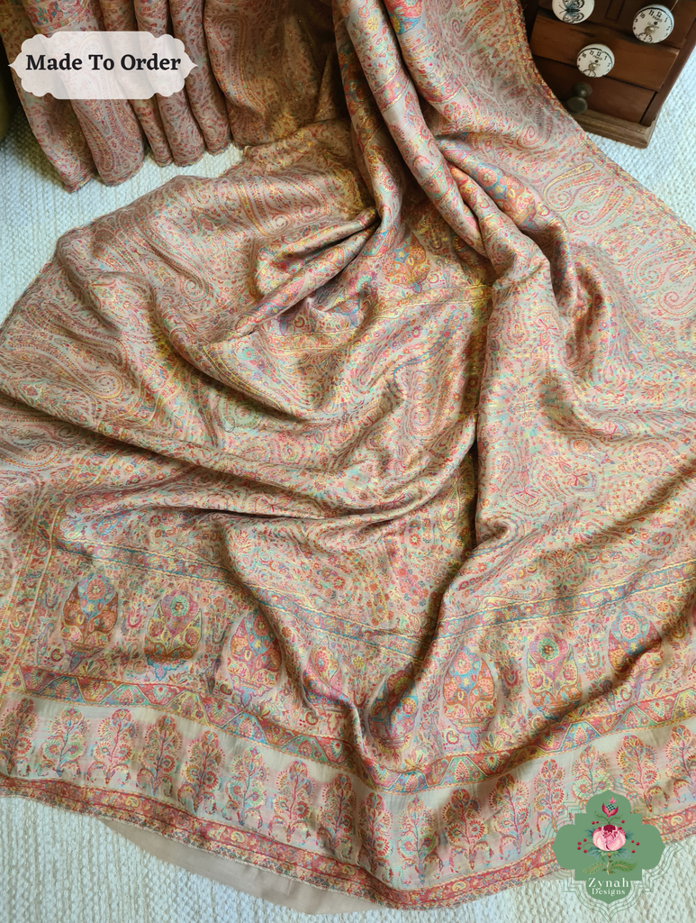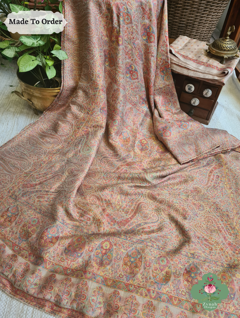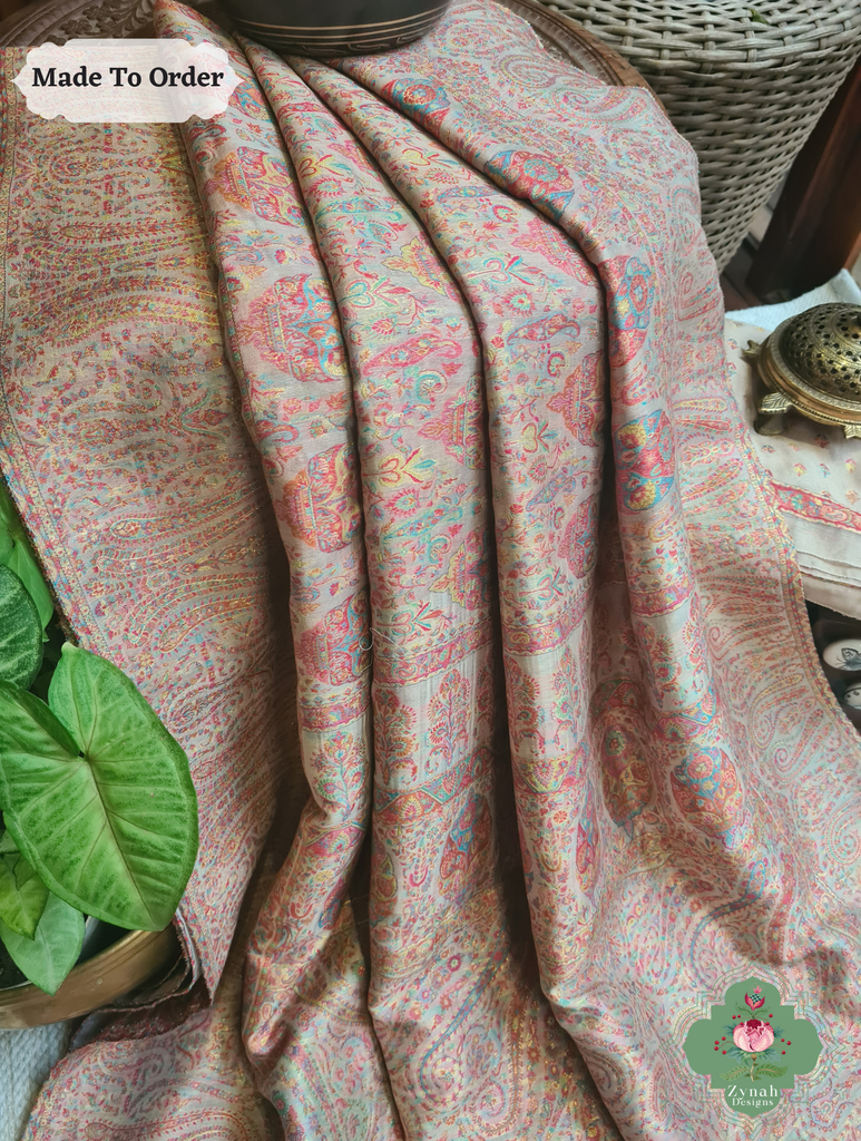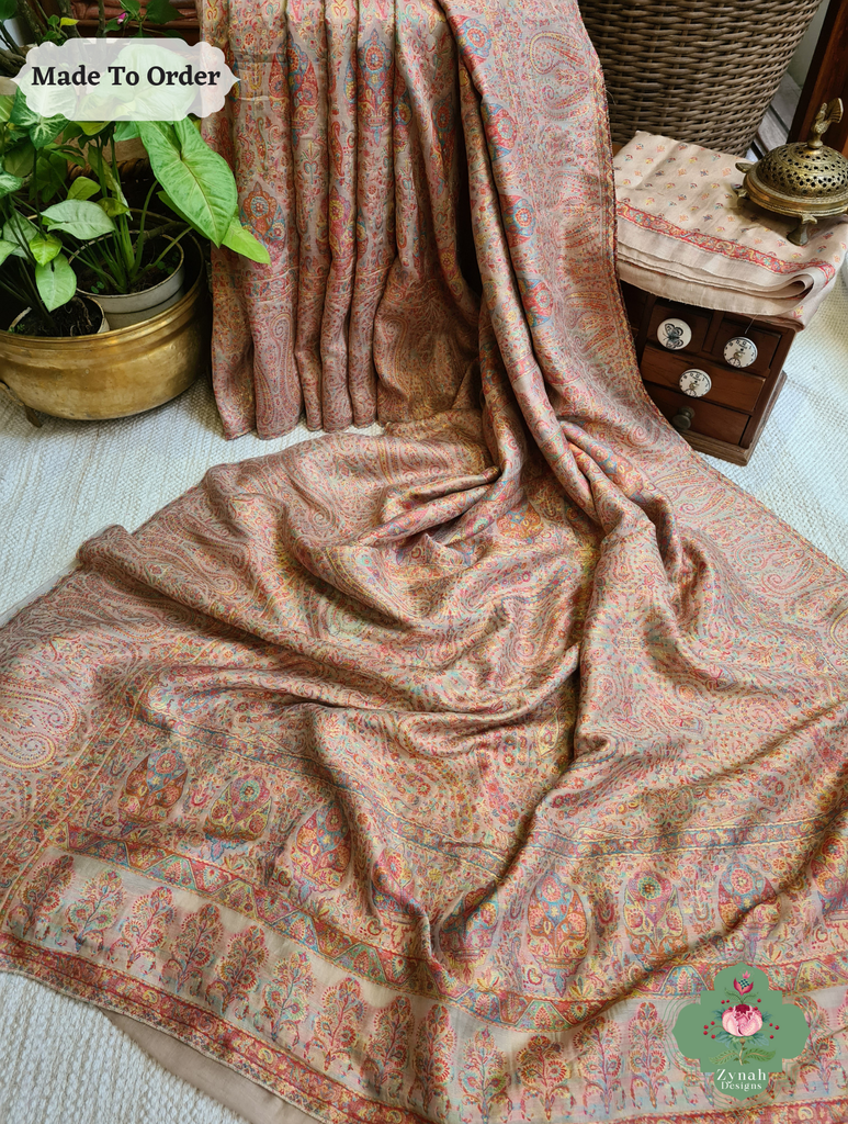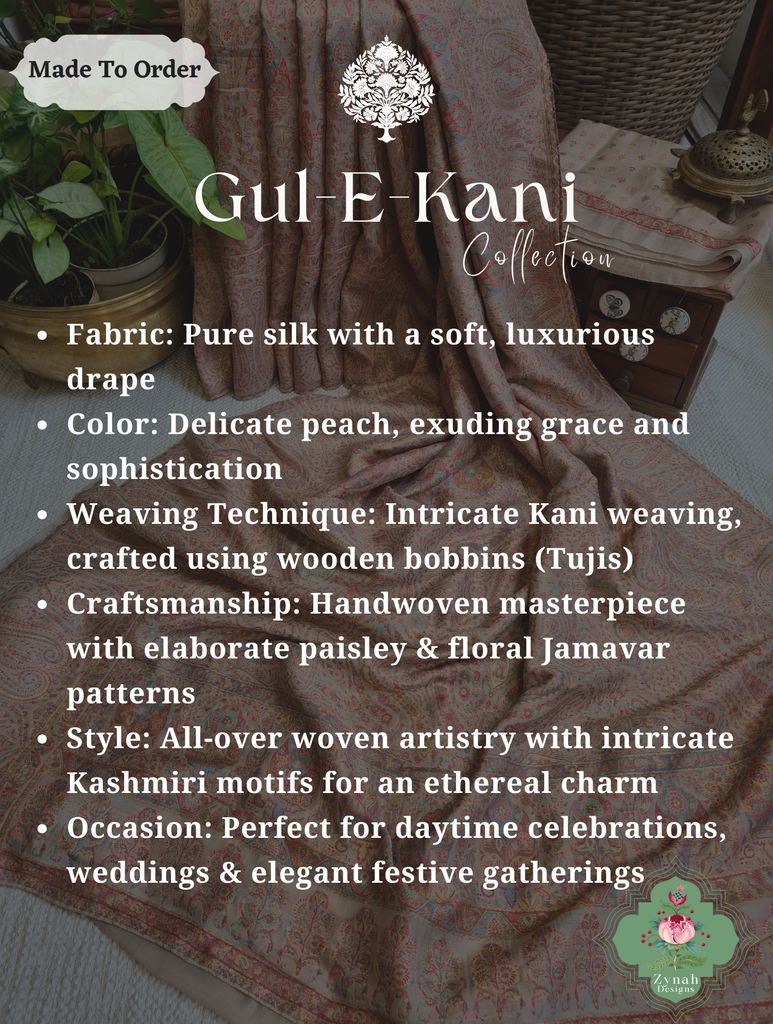 Centuries of Kashmiri artistry come to life in this Peach Kashmiri Pure Kani Silk Jamavar Saree. Woven with intricate floral Jaal Kani patterns, its delicate craftsmanship reflects the grandeur of a timeless tradition. Made from the finest silk, this handwoven Kashmiri Kani silk saree drapes effortlessly, exuding sophistication and grace. The rich detailing of this authentic Kani Jamavar silk saree makes it a perfect choice for weddings, festive occasions, and heirloom collections. Own this legacy—shop now!