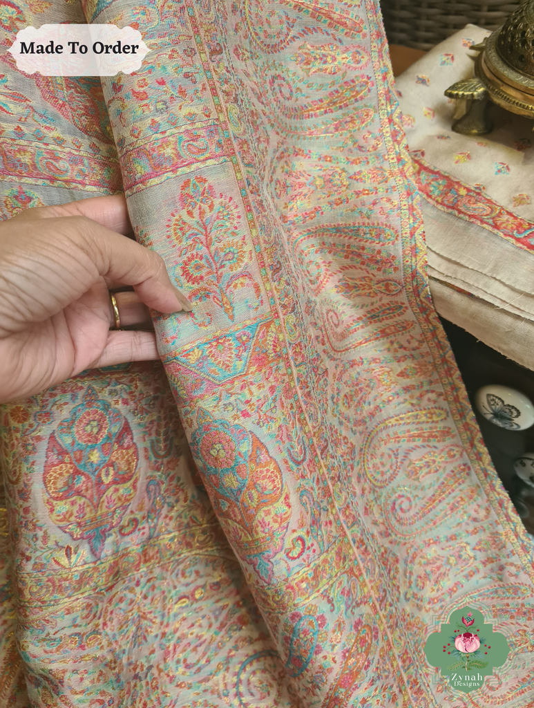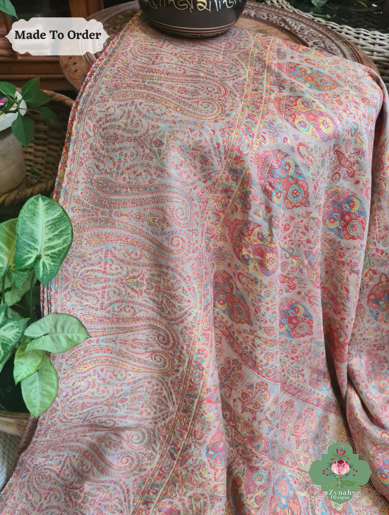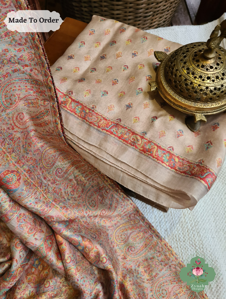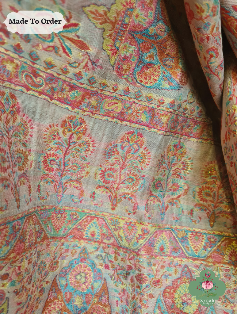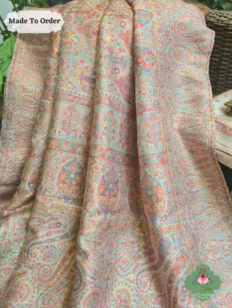 Centuries of Kashmiri artistry come to life in this Peach Kashmiri Pure Kani Silk Jamavar Saree. Woven with intricate floral Jaal Kani patterns, its delicate craftsmanship reflects the grandeur of a timeless tradition. Made from the finest silk, this handwoven Kashmiri Kani silk saree drapes effortlessly, exuding sophistication and grace. The rich detailing of this authentic Kani Jamavar silk saree makes it a perfect choice for weddings, festive occasions, and heirloom collections. Own this legacy—shop now!