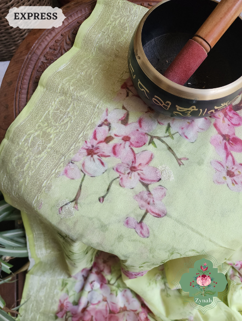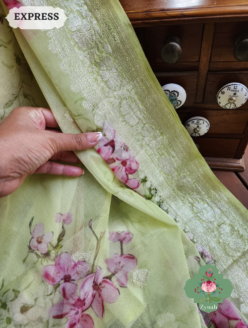 Zynah Lime Pure Khaddi Georgette Floral Banarasi Saree With Silver Zari; Custom Stitched/Ready-made Blouse, Fall, Petticoat; SKU: 2804202305