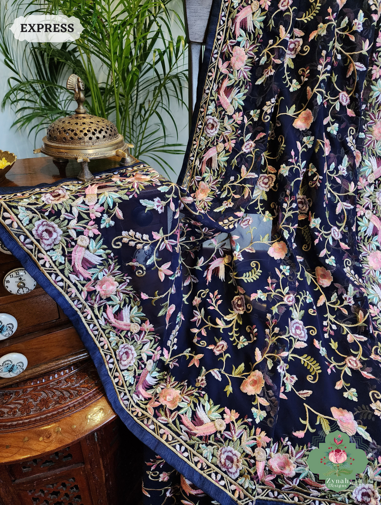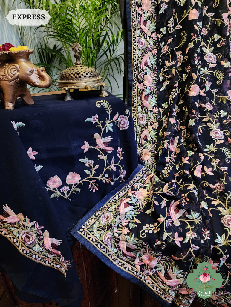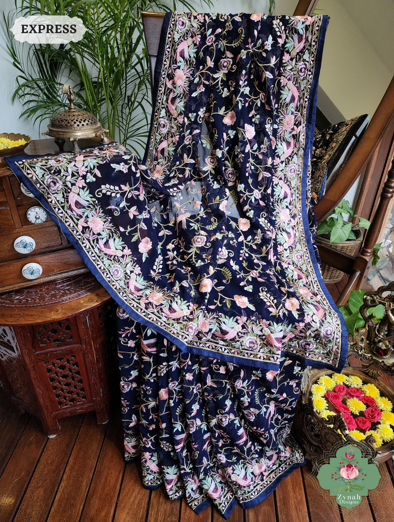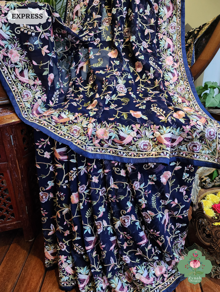 Zynah Blue Pure Georgette Saree with Parsi Gara Inspired Embroidery; Custom Stitched/Ready-made Blouse, Fall, Petticoat; SKU: 0604202402