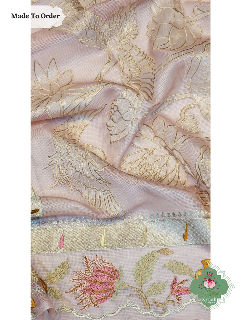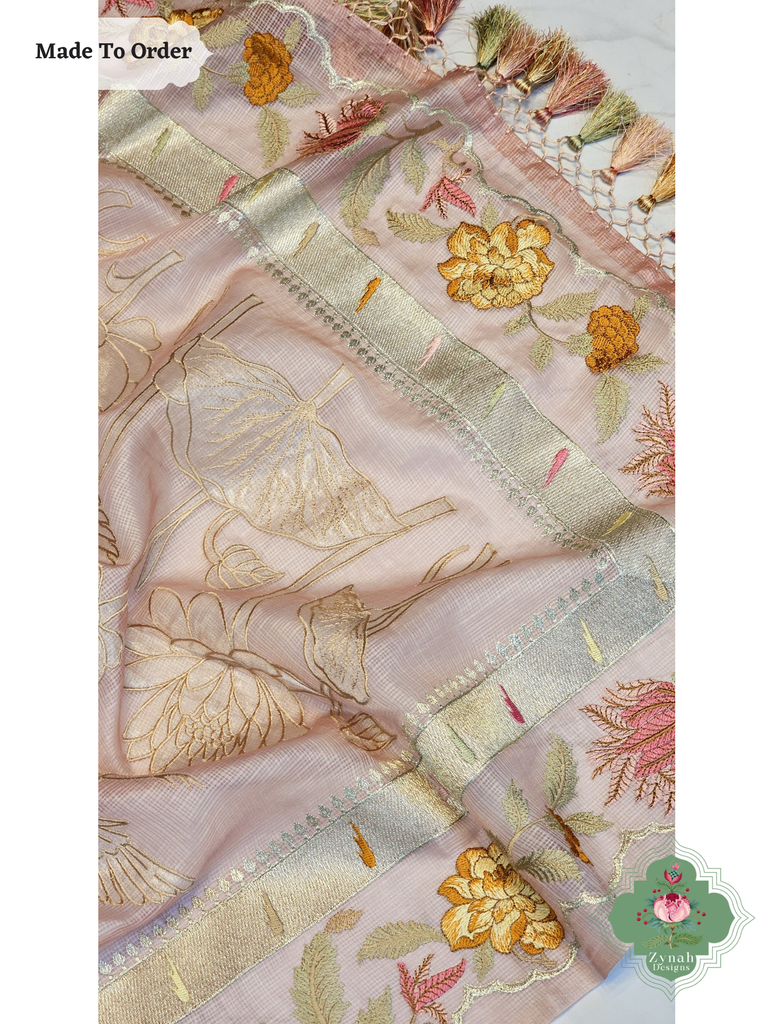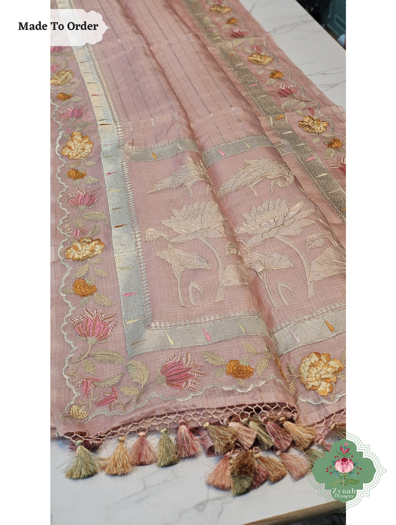 Soft peach tones meet intricate embroidery in this Kota Tussar silk saree designed for effortless charm. Its subtle sheen and feather-light feel make it a joy to wear from morning rituals to evening get-togethers. The handcrafted details bring out a quiet luxury that never goes unnoticed. Perfect for those who love elegance with a hint of warmth.