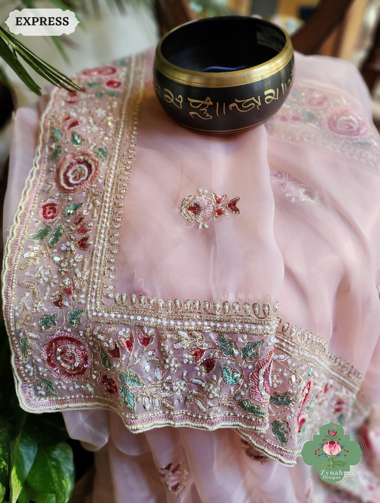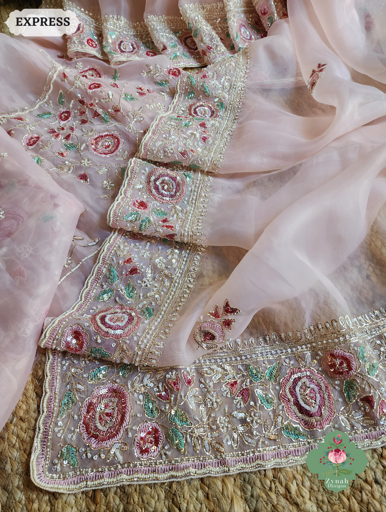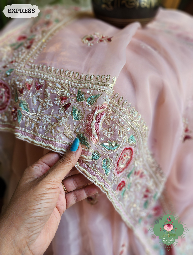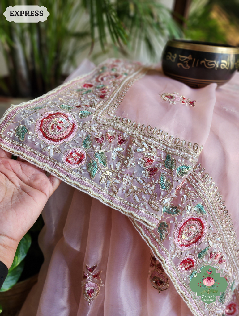Zynah Pink Organza Silk Saree With Thread Embroidery & Hand Embellished With Sequins, Pearls & Cutdana Beads; Custom Stitched/Ready-made Blouse, Fall, Petticoat; SKU: 1203202502