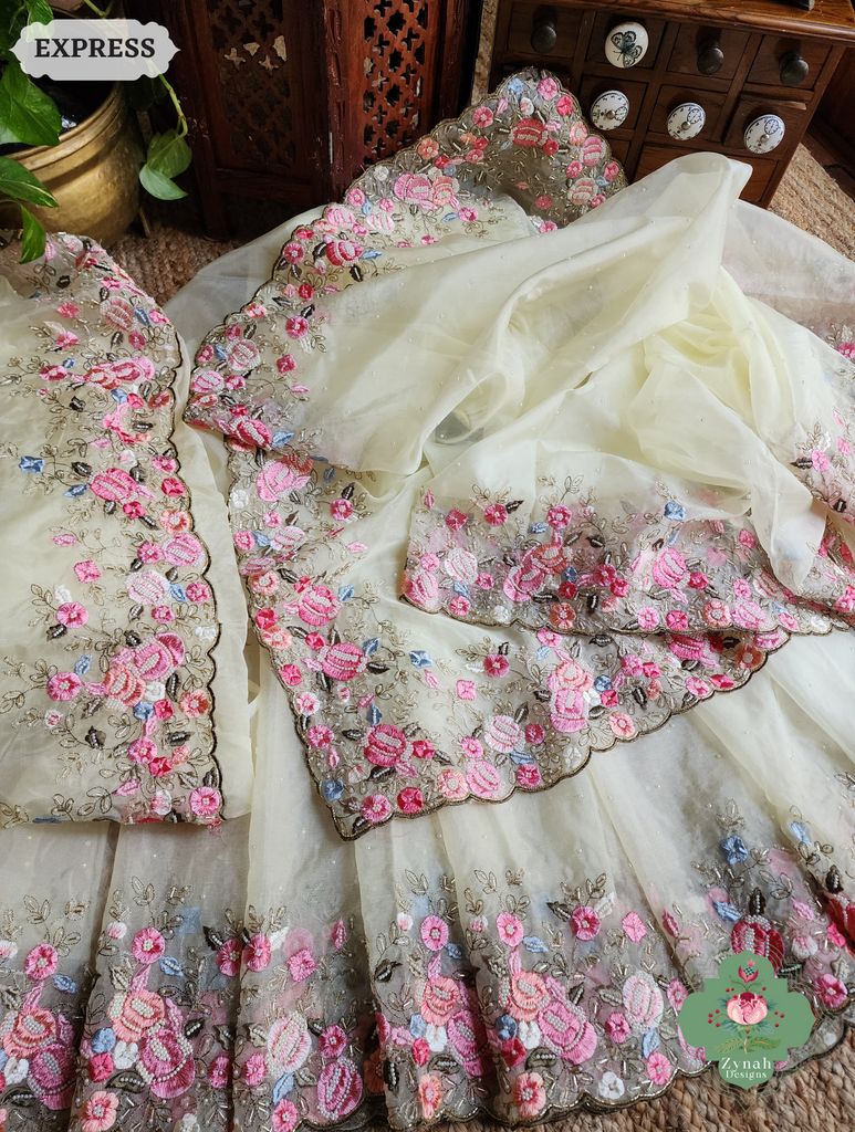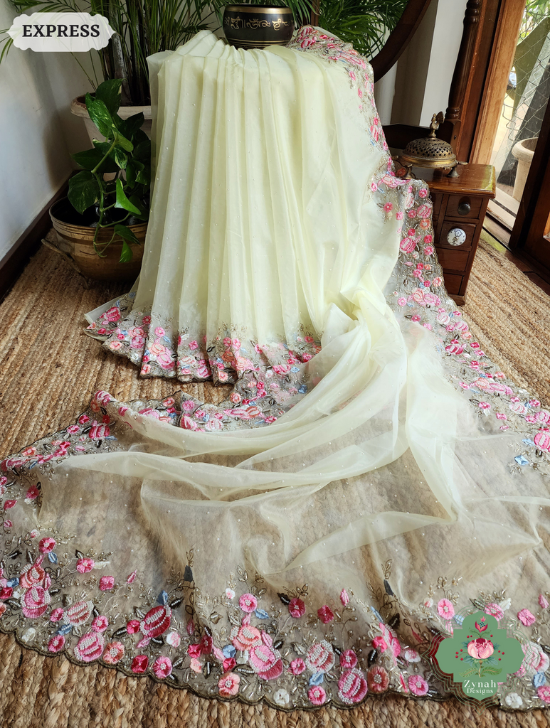 Zynah Pastel Lemon Yellow Organza Silk Saree With Delicate Floral Embroidery & Hand Embellished With Pearls & Cutdana Beads; Custom Stitched/Ready-made Blouse, Fall, Petticoat; SKU: 0503202501