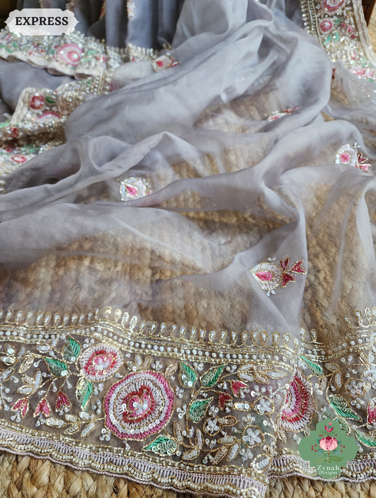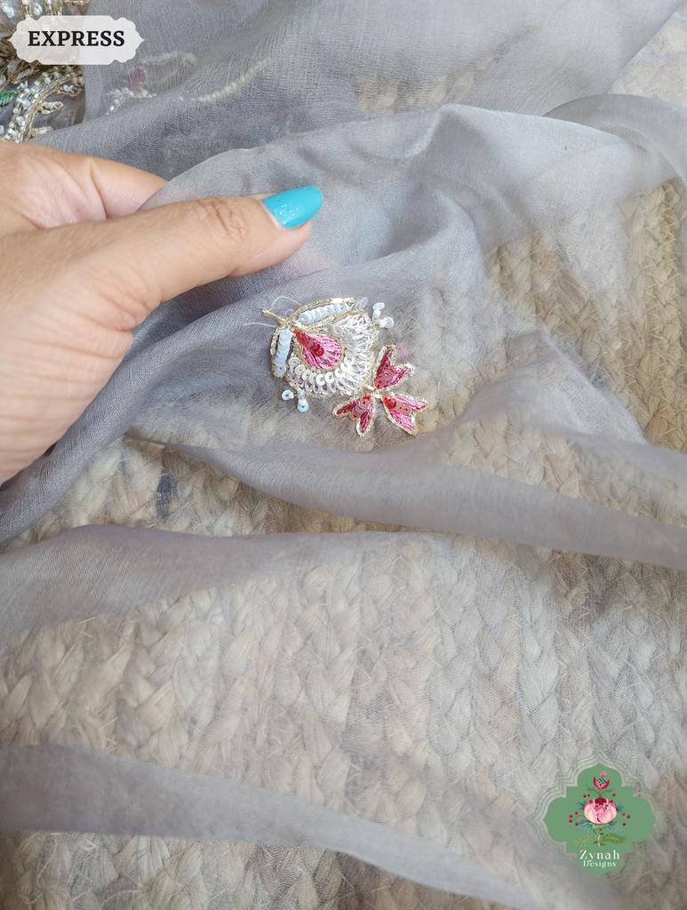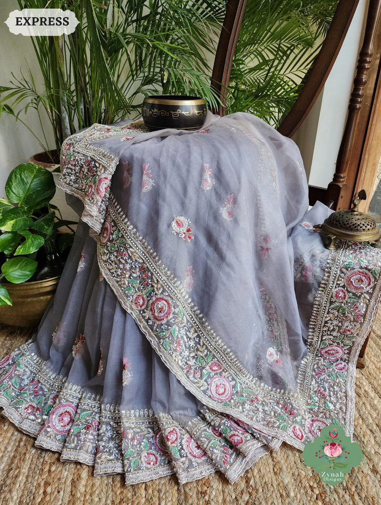 Exude understated elegance in this grey organza silk saree featuring exquisite thread embroidery and hand-embellished sequins, pearls, and cutdana beads. The sheer, lightweight fabric drapes with grace, offering a refined silhouette that’s perfect for sophisticated celebrations. Its subtle shimmer and intricate detailing make it a standout choice for those who admire quiet luxury. Make it yours—define elegance with every drape.