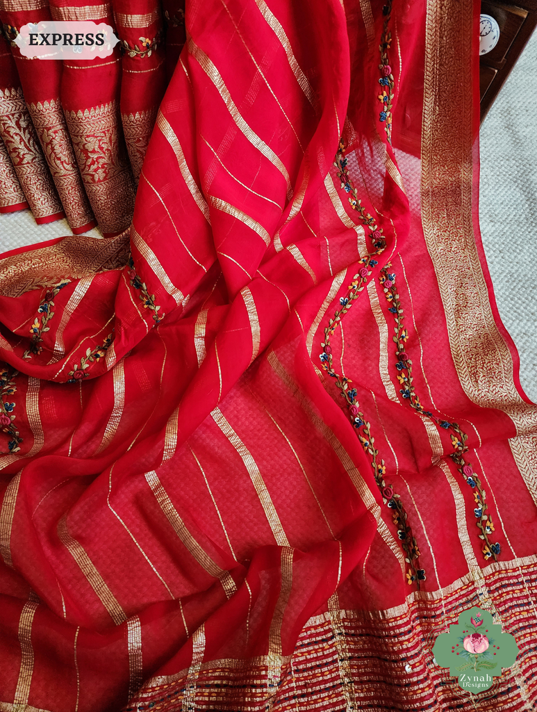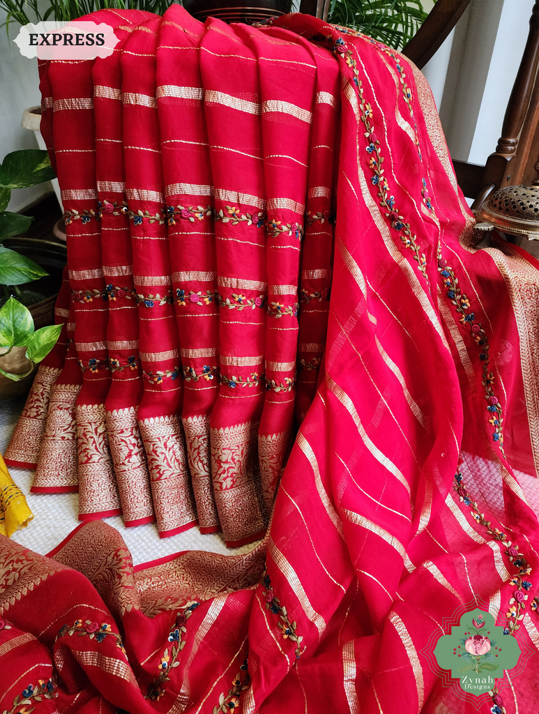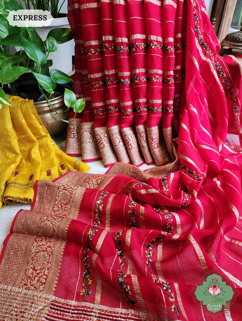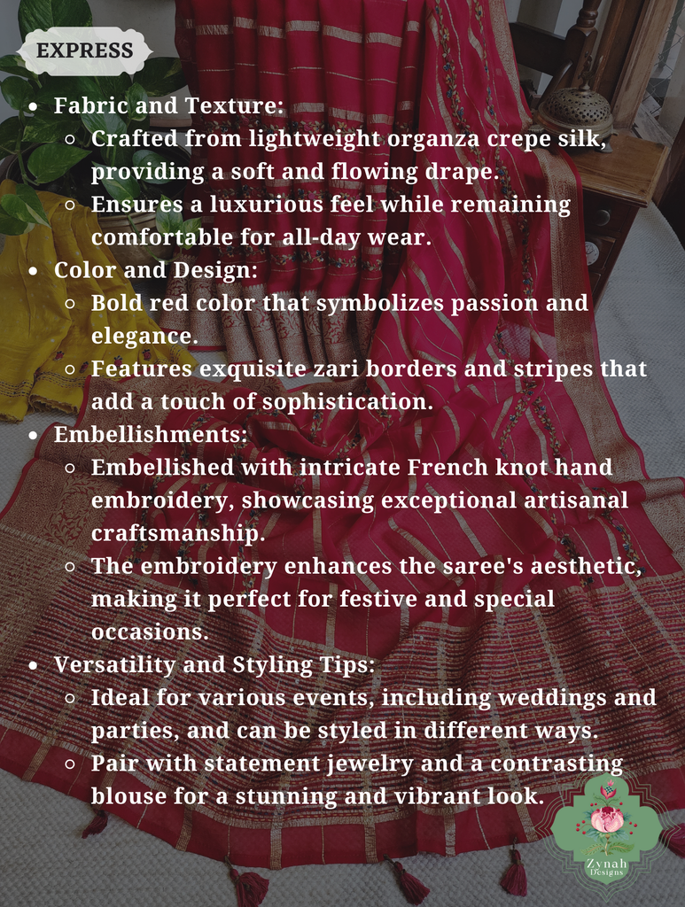 Zynah Red Organza Crepe Silk Saree With Zari Borders & Stripes & French Knot Hand Embroidery; Custom Stitched/Ready-made Blouse, Fall, Petticoat; SKU: 0710202404