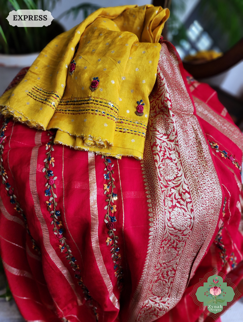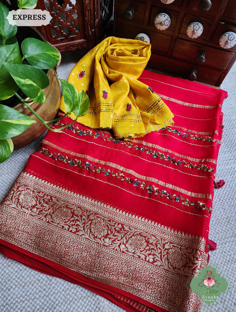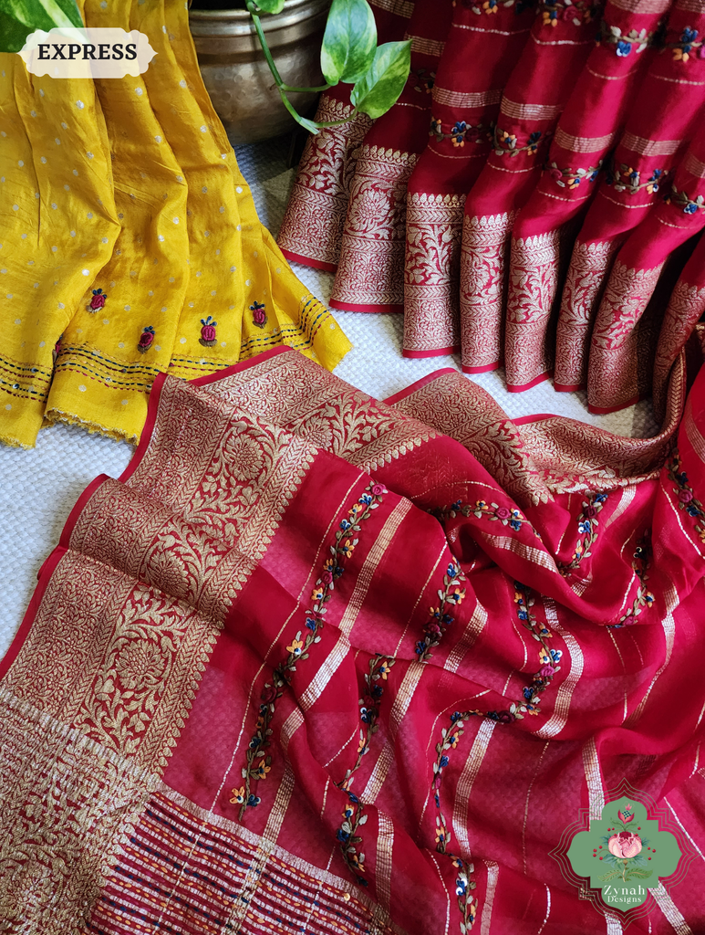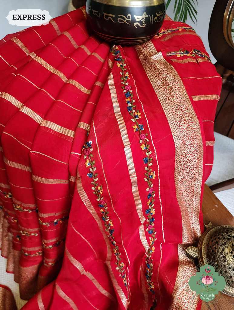 Zynah Red Organza Crepe Silk Saree With Zari Borders & Stripes & French Knot Hand Embroidery; Custom Stitched/Ready-made Blouse, Fall, Petticoat; SKU: 0710202404