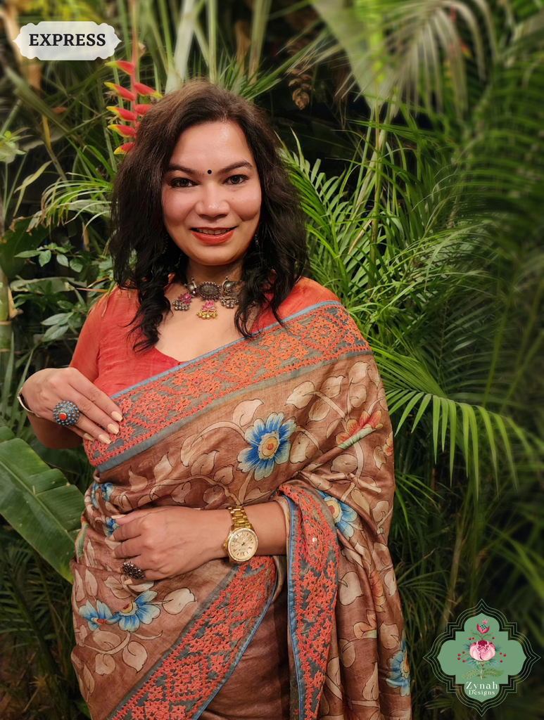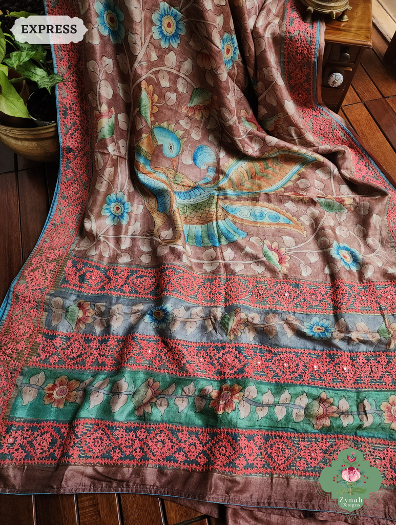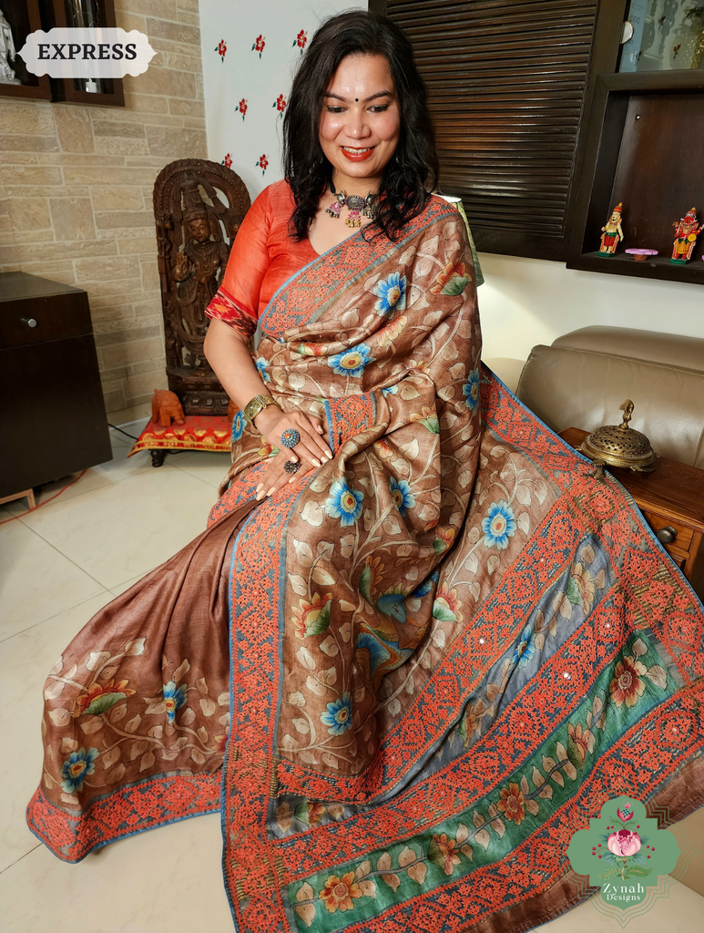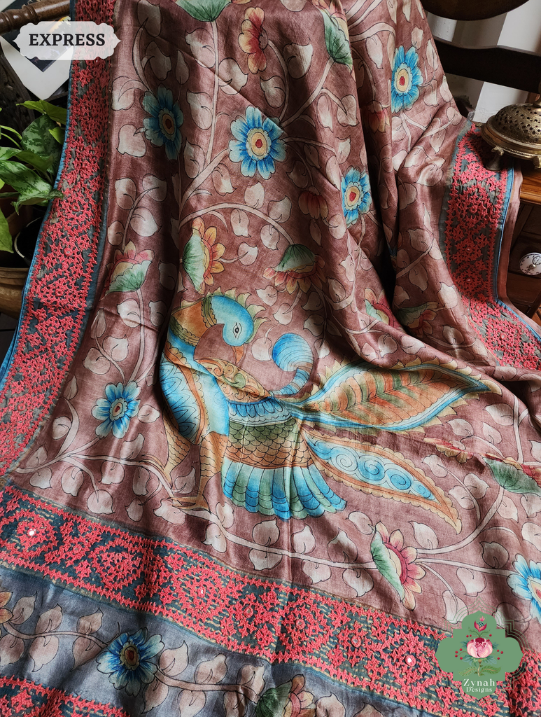 Graceful and grounded, this Mocha Hand-Painted Tussar Silk Kalamkari Saree blends earthy elegance with artistic heritage. The rich mocha hue sets a warm, sophisticated tone, while hand-painted Kalamkari motifs narrate tales of tradition. Accentuated with vibrant Kutch hand embroidery, each detail adds depth and texture to the luxurious silk drape. Perfect for festive gatherings or refined occasions, this saree is a timeless tribute to craftsmanship. Embrace its charm and make it yours today.