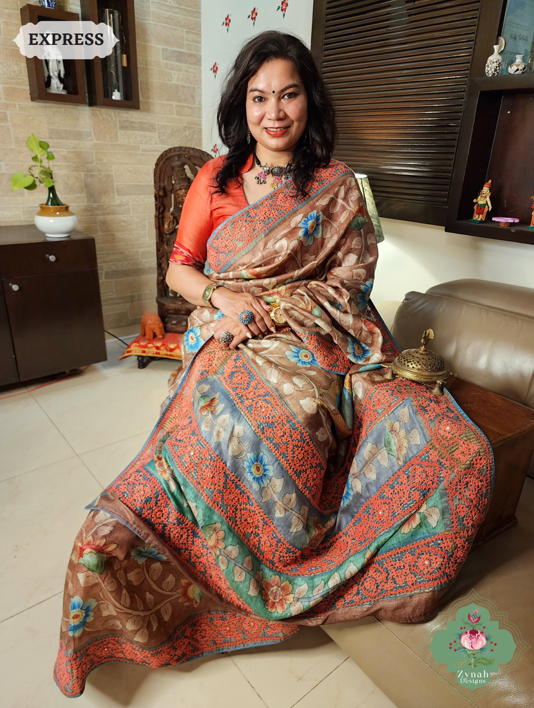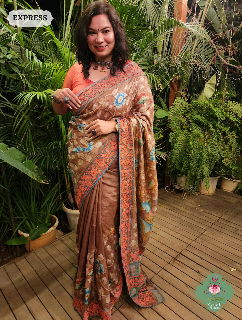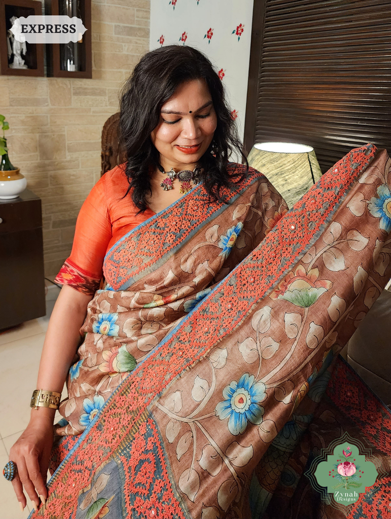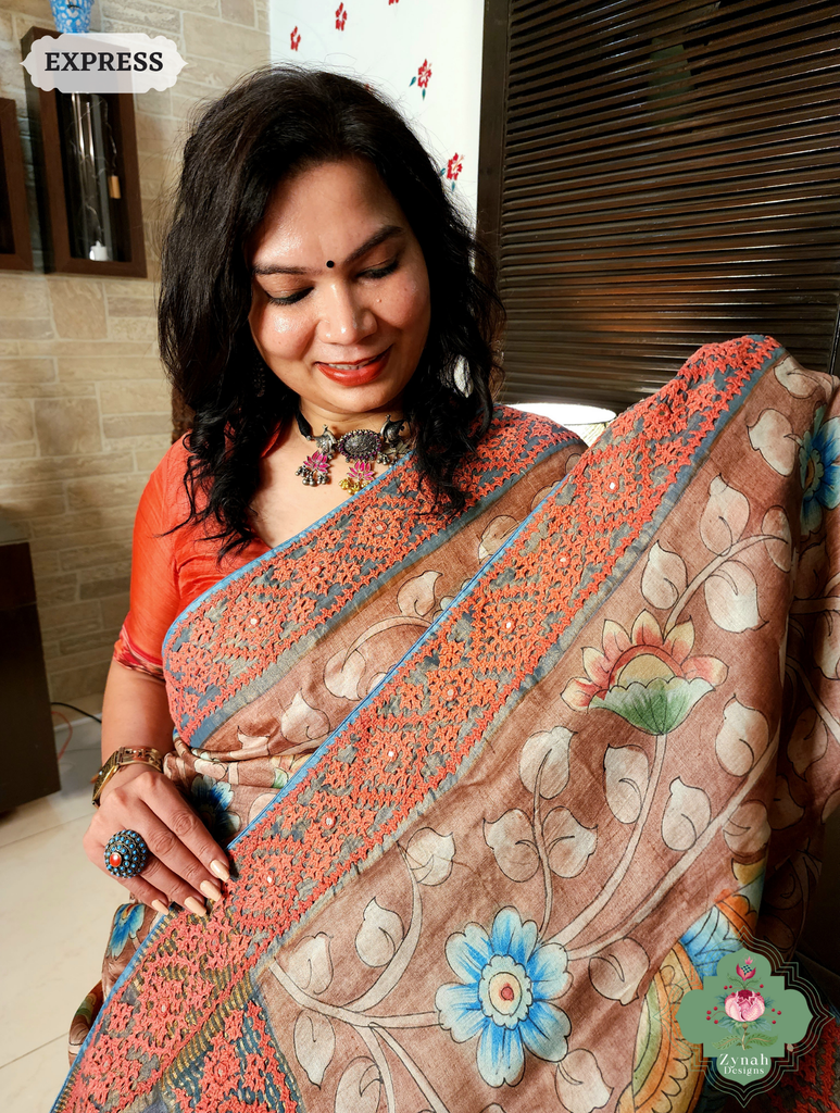 Graceful and grounded, this Mocha Hand-Painted Tussar Silk Kalamkari Saree blends earthy elegance with artistic heritage. The rich mocha hue sets a warm, sophisticated tone, while hand-painted Kalamkari motifs narrate tales of tradition. Accentuated with vibrant Kutch hand embroidery, each detail adds depth and texture to the luxurious silk drape. Perfect for festive gatherings or refined occasions, this saree is a timeless tribute to craftsmanship. Embrace its charm and make it yours today.