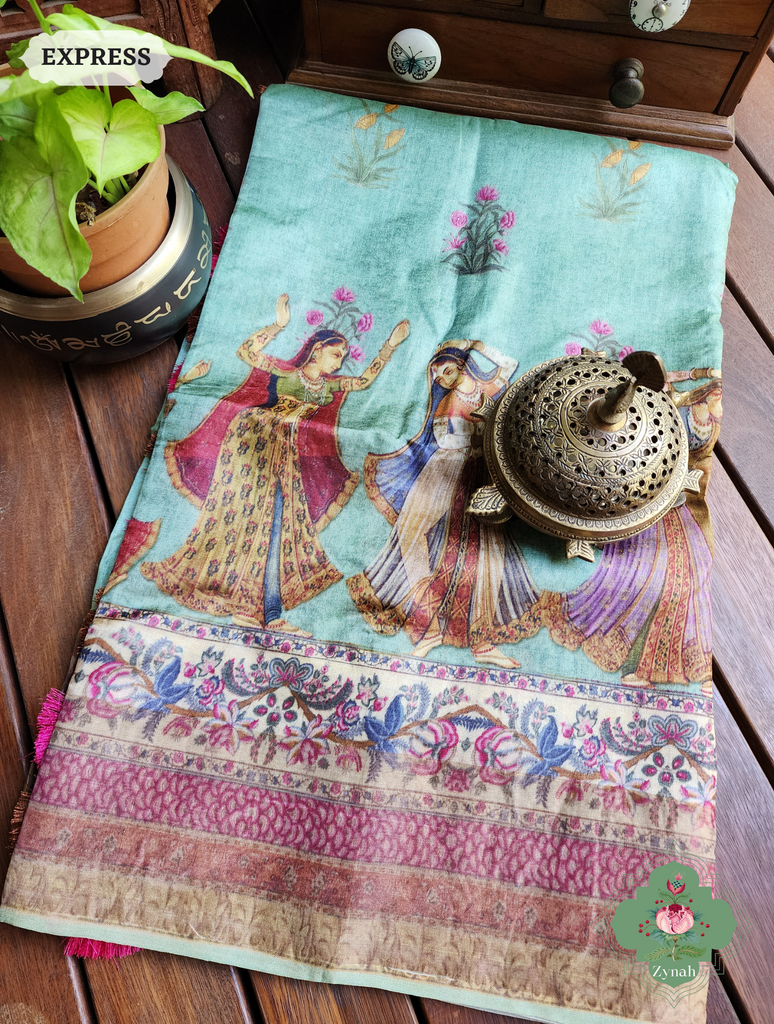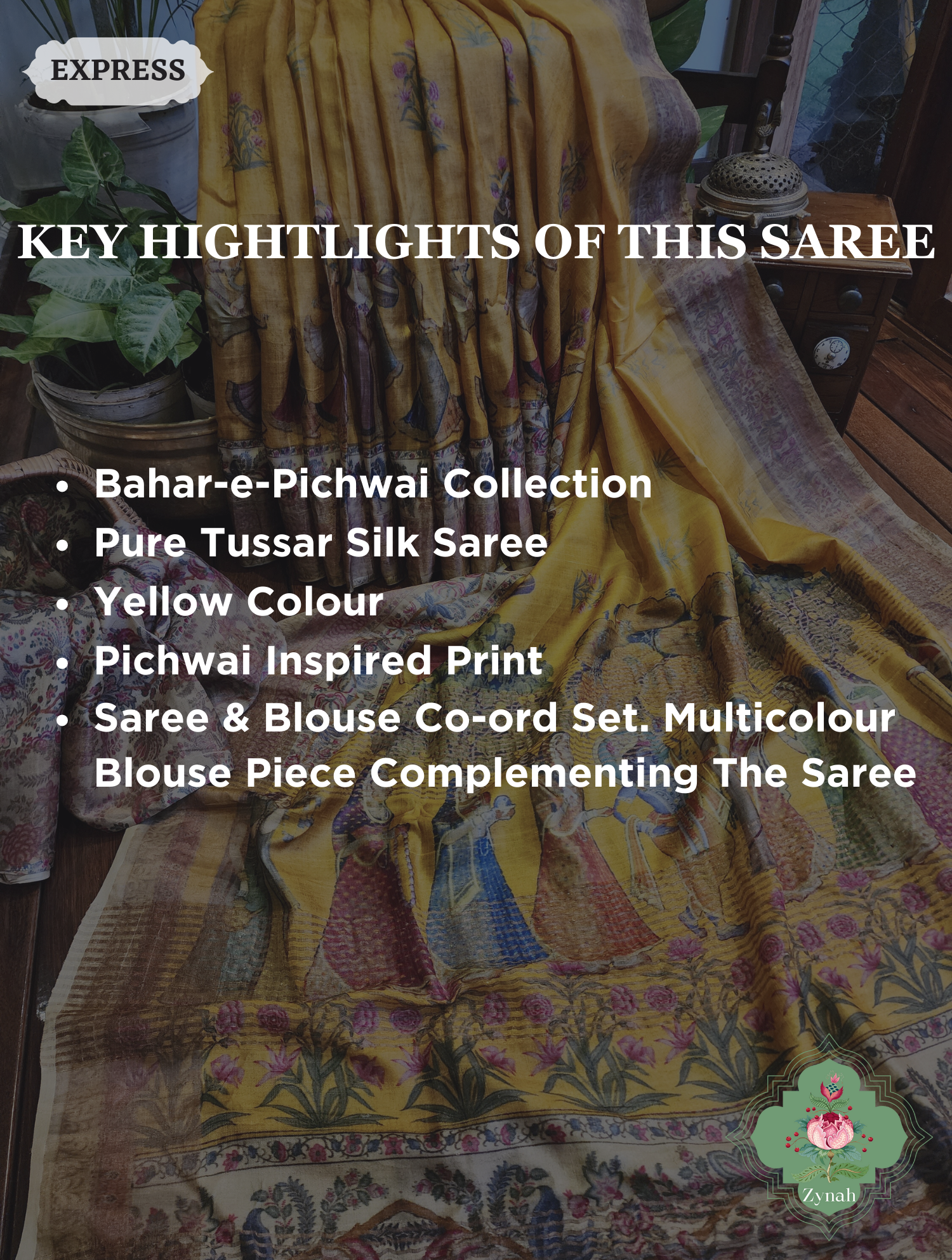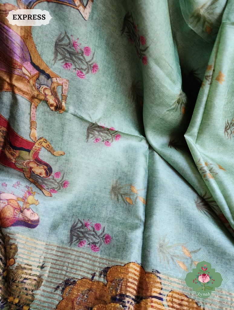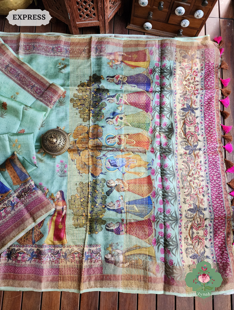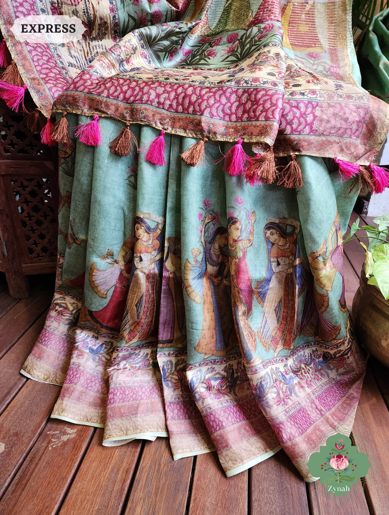 Zynah Pista Green Pure Tussar Silk Saree With Pichwai Print; Custom Stitched/Ready-made Blouse, Fall, Petticoat; SKU: 2306202302