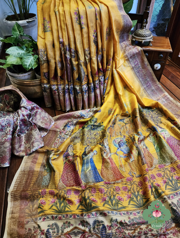 Indulge in the mesmerizing fusion of art and tradition with our exquisite Pista Green Pure Tussar Silk Saree. Handcrafted to perfection, this saree showcases the timeless allure of Tussar silk adorned with the enchanting Pichwai print. Immerse yourself in a vibrant tapestry of colors and be enthralled by the intricate patterns that grace this remarkable creation.