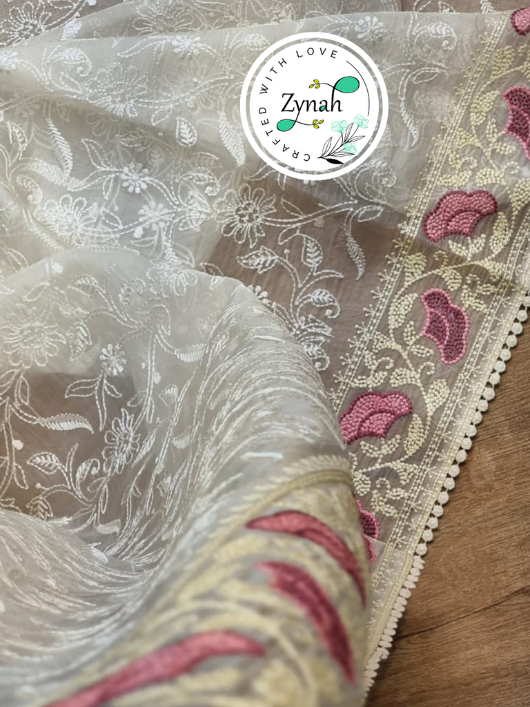 Zynah Off-White Color Pure Organza Silk Chikankari Embroidery Saree with Crochet Lace in Pastel Shades; Available in many colors; stitched readymade blouse,fall,petticoat,available in USA