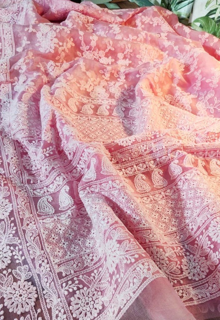 This is an exclusive pure organza silk saree in light pink color with chikankari embroidery work. The enduring quality of the weave and texture is the absolute beauty of this saree.